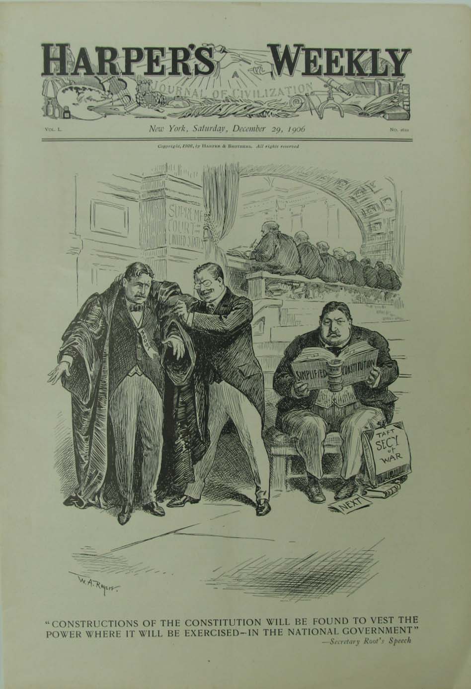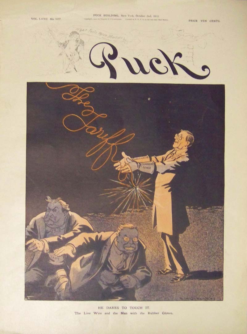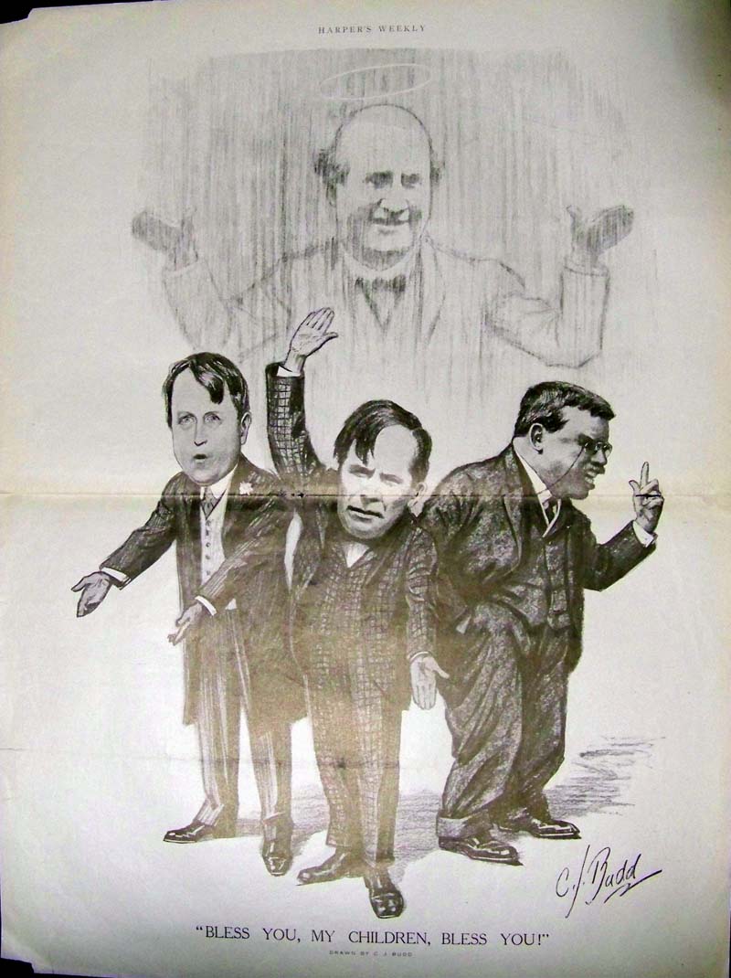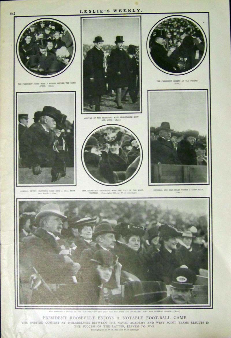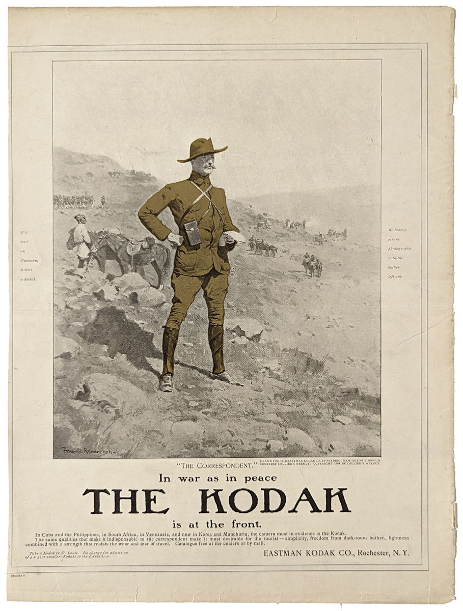 ![]() 056ted: 1887 double-page Chromolithograph from Puck by J. Ottman, Lithographers. Artist is J. Keppler. Caption underneath reads, "Little Roosevelt!!! - The Grand Old Party Must Be Hard-Up!" 20-1/2 x 14 in. $50 ![]() 058ted: C.1905 Double-page half-tone drawn by C.J. Budd featured in Harper's Weekly. Caption reads, "Bless You, My Children, Bless You!" Scene shows Roosevelt and two other politicians gesturing with their hands in foreground and another faint image of a man with a halo over his head standing above them. 21 x 16 in. $90 ![]() 066ted: 1908 Half-tone from Harper's Weekly, A Journal of Civilization with the caption reading, "The "Square Deal" Dance." Scene shows a man looking out of a window at another man named Mellen jumping to get away from bullets shot by a man known as Bonaparte. W.A. Rogers, artist. 13 x 9 in. $50 ![]() 005fox: 1886 Meadow Brook Hunt Club Meet at House of Roosevelt, Oyster Bay, Long Island - Harper's Weekly hand colored wood engravings. Upper image shows "The $29,000 Filly Dew-Drop." 16 x 11 in. $60 ![]() 071ted: 1884 Harper's Weekly, A Journal of Civilization half-tone showing, "Our New Watchman, Roosevelt." Thomas Nast is the artist. 16 x 11 in. $60 ![]() 076ted: 1912 Chromolithograph from Puck showing President Wilson with the words, Fearlessness and Common Sense on his sleeves holding a live wire which reads, "The Tariff" as Taft and Roosevelt try running away. Caption reads, "He Dares To Touch It." 13-1/2 x 10 in. $80 ![]() 084ted: 1909 Ten hand colored half-tones showing Theodore Roosevelt, HUnter from the East African trip he made with his son, Kermit after leaving the presidency. Featured in Collier's and in very good condition. The side border edges are trimmed close. 19-1/2 x 14-1/2 in. $125 ![]() 110ted: The Roosevelt Bears at Niagara - "They started off at once to view the rolling rapids and the big horseshoe." 1907 Edward Sten & Co. 8 1/8 x 11 in. $40 ![]() 111ted: "One to Three You're Left-Handed." by Gretta Palmer. Interesting article on how teachers and parents forced them to use their right hands; againts their natural tendency. Roosevelt, one of the many left-handed Presidents. 10 x 13 3/4 in. $30 ![]() 116ted: "Shoot, if you must, this old grey head, But spare your country's flag,' she said." 1912 Harper's Weekly. **Library stamp left quadrent. 10 5/8 x 15 3/4 in. $60 ![]() 117ted: The Rough Riders at La Quasina. Depicting action at the Battle of Las Guasimas in the first land engagement of the Spanish-American War. 1899. 14 1/2 x 21 7/8 in. $60 ![]() 119ted: "The Correspondent" - In war as in peace The Kodak is at the front. 1904 Collier's Weekly. Ad featuring Roosevelt for Kodak Co. 10 5/8 x 14 1/8 in. $30 ![]() 121ted: The Colonel in Action. 1912 Harper's Weekly. Half-tone engraving. 11 x 15 1/2 in. $30 ![]() 122ted: President Roosevelt writing the message which opened the new Pacific Cable. 1903 Harper & Brothers. Half-tone print. 9 3/8 x 13 1/4 in. $30 |