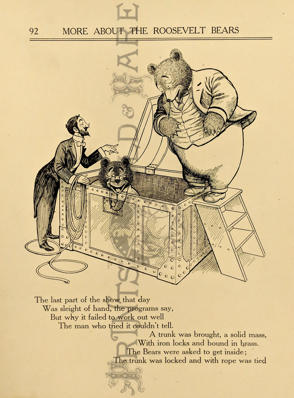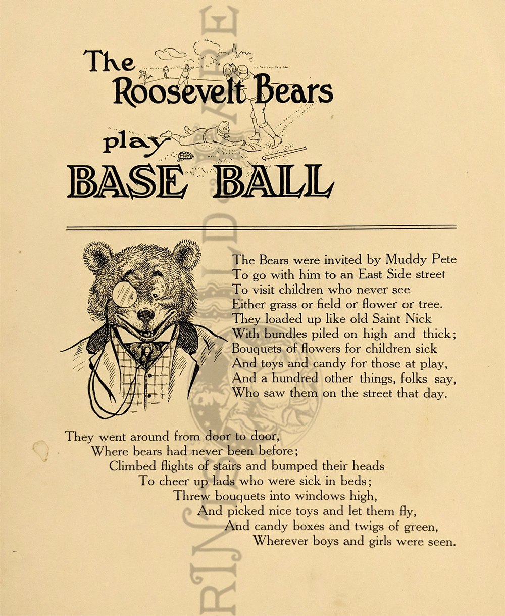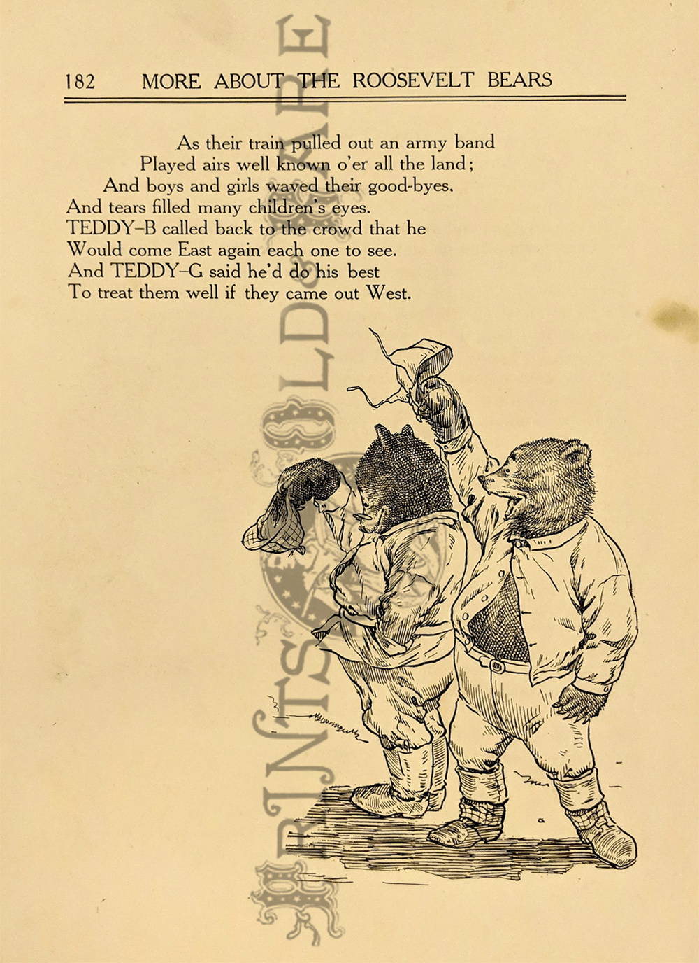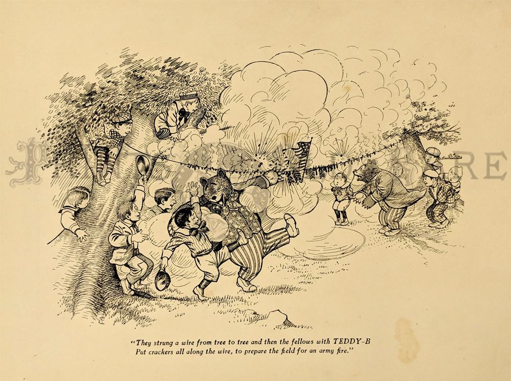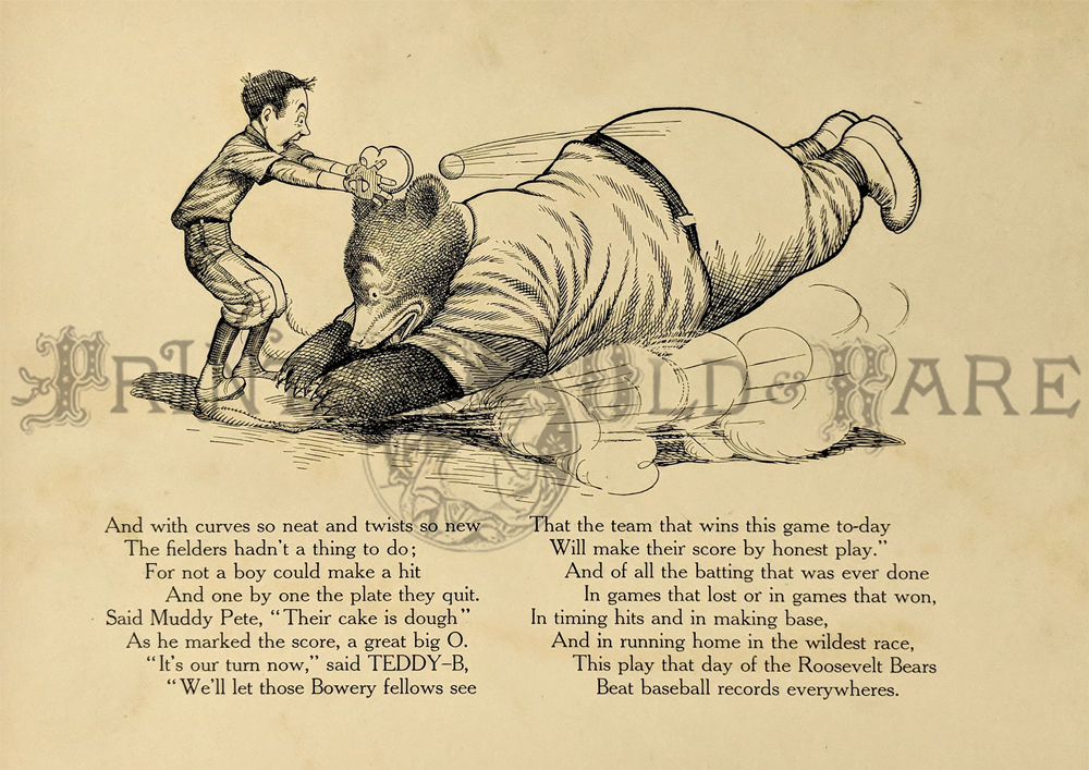 "The Roosevelt Bears" Drawings and verse about two bears (TEDDY-G & TEDDY-B.) who traveled east to see President Theodore Roosevelt. Only two years before, Roosevelt, amused by a cartoon showing him refusing to shoot a bear, had given permission for his name to be used for a new toy, the "Teddy Bear." ![]() 087ted: "TEDDY-B threw the monkey and made him yell, And caught him every time he fell." 1907 Edward Sten & Co. 8 1/8 x 11 in. $40 ![]() 088ted: "We've sailed before, said TEDDY-B, 'We hit Chicago down a tree.'" 1907 Edward Sten & Co. 8 1/8 x 11 in. $40 ![]() 089ted: "'You mind these things,' said TEDDY-G, 'Our breakfast hour is half-past three.'" 1907 Edward Sten & Co. 8 1/8 x 11 in. $40 ![]() 090ted: "'But the play that caused the biggest laugh Was TEDDY-G on a big giraffe.'" 1907 Edward Sten & Co. 8 1/8 x 11 in. $40 ![]() 091ted: "In timing hits and in making base, And in running home in the wildest race, This play that day of the Roosevelt Bears Beat base records everywheres." 1907 Edward Sten & Co. 8 1/8 x 11 in. $30 ![]() 092ted: "They came from the clouds like sailors bold, with not a thing but the rope to hold." 1907 Edward Sten & Co. 8 1/8 x 11 in. $30 ![]() 094ted: "The Bears Celebrate the Fourth" 1907 Edward Sten & Co. 8 1/8 x 11 in. $30 ![]() 095ted: "The Bears Celebrate the Fourth" - "With a slap and bang, in smoke and noise, Like any two July Fourth boys." 1907 Edward Sten & Co. 8 1/8 x 11 in. $30 ![]() 096ted: They looked so jolly and smiled so sweet, That the children clapped and stamped their feet. And waved their hands and stoop on chairs, And cried, "Hurrah for the Roosevelt Bears!" 1907 Edward Sten & Co. 8 1/8 x 11 in. $30 ![]() 097ted: The Bears Celebrate the Fourth. "Shot rockets just to try, To hit the things up in the sky." 1907 Edward Sten & Co. 8 1/8 x 11 in. $30 ![]() 098ted: The Roosevelt Bears visit Washington - "Dee-lighted."1907 Edward Sten & Co. 8 1/8 x 11 in. $30 ![]() 099ted: "The Bears were asked to come next day, At an early hour to have a play, On the White House grounds and in children's tent and breafast with the President." 1907 Edward Sten & Co. 8 1/8 x 11 in. $30 ![]() 100ted: More About the Roosevelt Bears - "And boys and girls wave their good-byes. And tears filled many children's eyes." 1907 Edward Sten & Co. 8 1/8 x 11 in. $30 ![]() 101ted: More About the Roosevelt Bears - "A trunk was brought, a solid mass, With iron locks and bound in brass." 1907 Edward Sten & Co. 8 1/8 x 11 in. $30 ![]() 102ted: The Roosevelt Bears play Baseball - "The Bears were invited by Muddy Pete, to go with him to an East Side street." 1907 Edward Sten & Co. 8 1/8 x 11 in. $30 ![]() 103ted: The Bears Celebrate the Fourth - "As a safety valve for them and you, To keep things running square and true." 1907 Edward Sten & Co. 8 1/8 x 11 in. $30 ![]() 104ted: More About the Roosevelt Bears - "They breakfasted the following day, With the President and had their play." 1907 Edward Sten & Co. 8 1/8 x 11 in. $30 ![]() 105ted: More About the Roosevelt Bears - "He was hooped around from head to paw, The funniest sight you ever saw." 1907 Edward Sten & Co. 8 1/8 x 11 in. $30 ![]() 107ted: The Bears Entertain Philadelphia Children - "And through the halls walked round and round, But not a trace of the Bears they found." 1907 Edward Sten & Co. 8 1/8 x 11 in. $20 ![]() 108ted: "Big Teddy Bear For You." Cute advertisement for the Teddy Bear & The Whole Bear Family. They are all the rage! 7 x 10 in. $40 ![]() 109ted: "They strung a wire from tree to tree and then the fellows with TEDDY-B, Put crackers all along the wire, to prepare the field fro an army fire." 1907 Edward Sten & Co. 8 1/8 x 11 in. $30 |