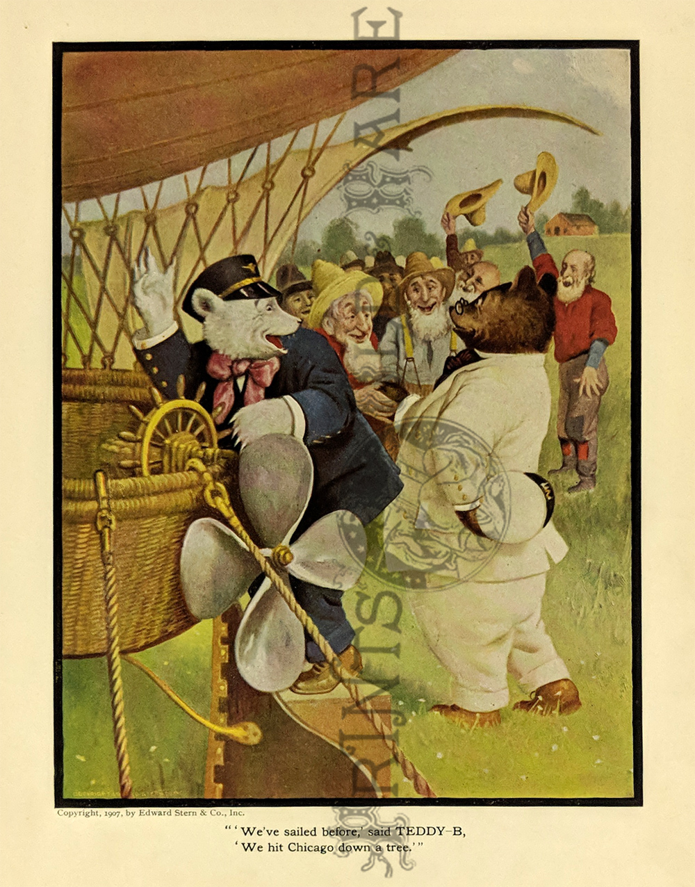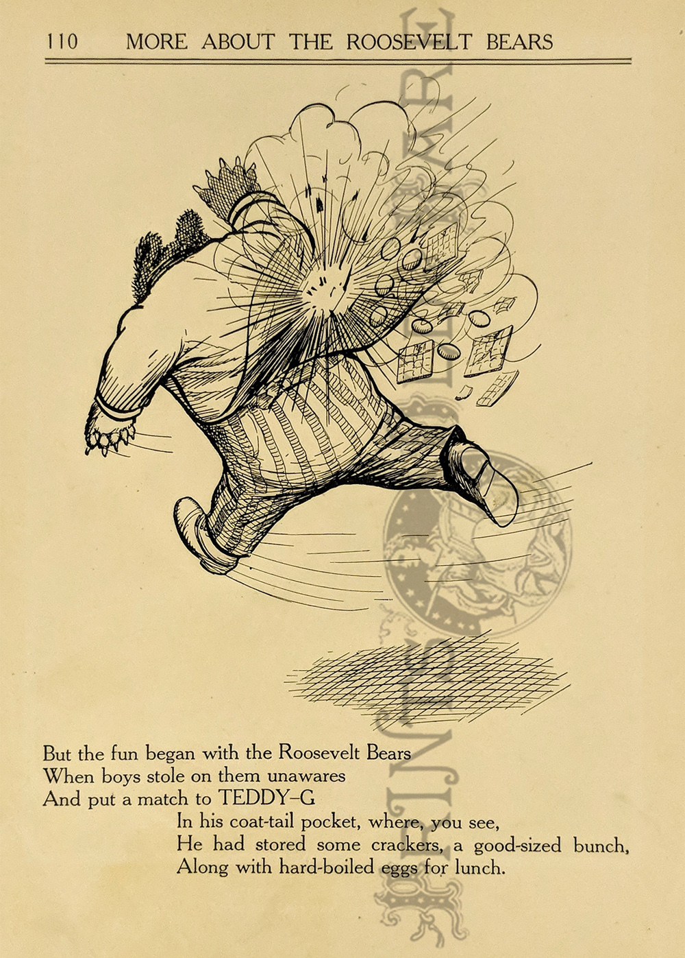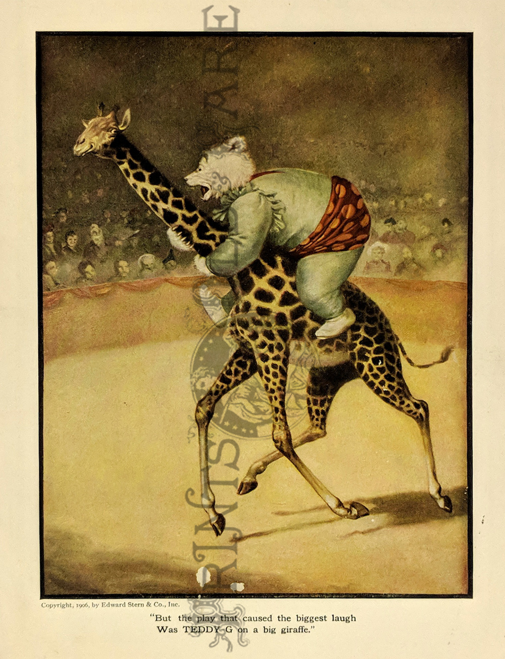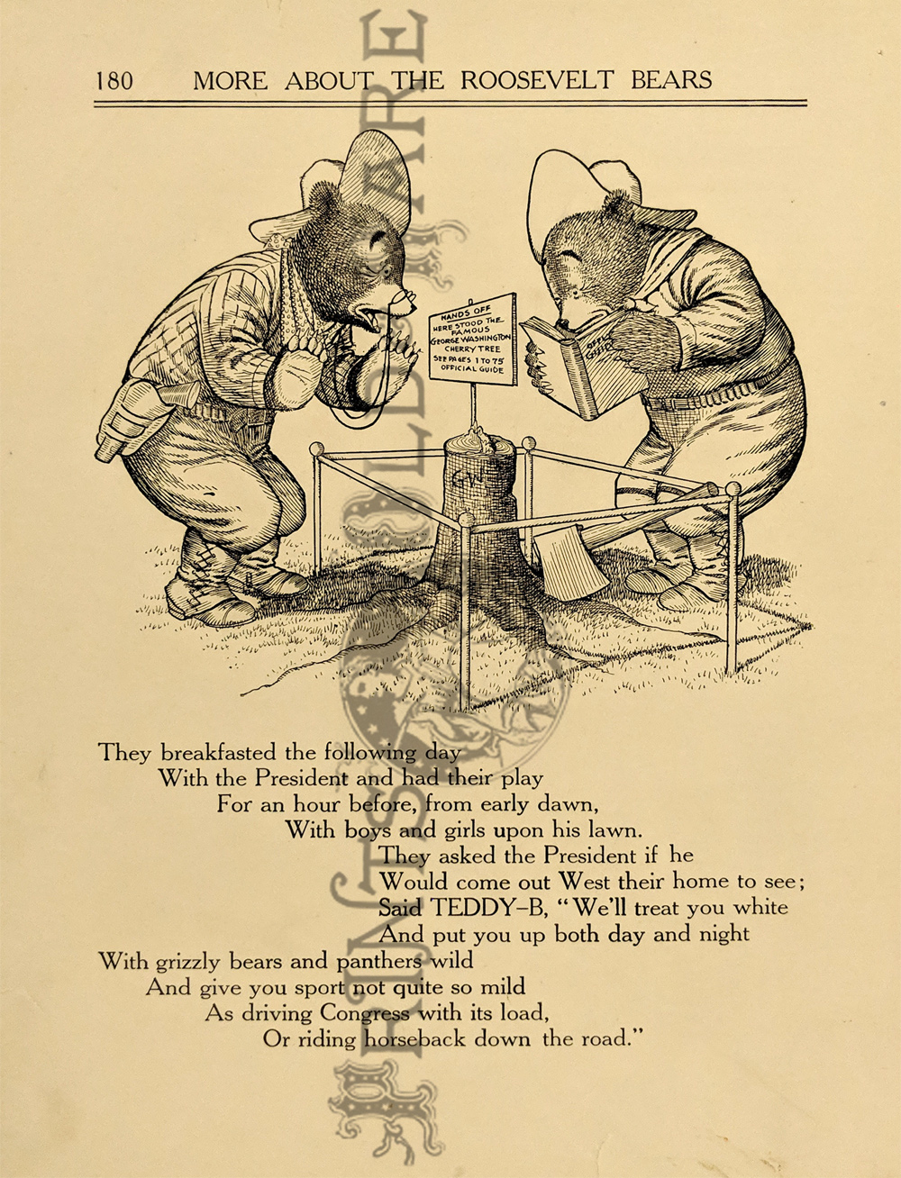 "The Roosevelt Bears" Drawings and verse about two bears (TEDDY-G & TEDDY-B.) who traveled east to see President Theodore Roosevelt. Only two years before, Roosevelt, amused by a cartoon showing him refusing to shoot a bear, had given permission for his name to be used for a new toy, the "Teddy Bear." ![]() 087ted: "TEDDY-B threw the monkey and made him yell, And caught him every time he fell." 1907 Edward Sten & Co. 8 1/8 x 11 in. $40 ![]() 088ted: "We've sailed before, said TEDDY-B, 'We hit Chicago down a tree.'" 1907 Edward Sten & Co. 8 1/8 x 11 in. $40 ![]() 089ted: "'You mind these things,' said TEDDY-G, 'Our breakfast hour is half-past three.'" 1907 Edward Sten & Co. 8 1/8 x 11 in. $40 ![]() 090ted: "'But the play that caused the biggest laugh Was TEDDY-G on a big giraffe.'" 1907 Edward Sten & Co. 8 1/8 x 11 in. $40 ![]() 091ted: "In timing hits and in making base, And in running home in the wildest race, This play that day of the Roosevelt Bears Beat base records everywheres." 1907 Edward Sten & Co. 8 1/8 x 11 in. $30 ![]() 092ted: "They came from the clouds like sailors bold, with not a thing but the rope to hold." 1907 Edward Sten & Co. 8 1/8 x 11 in. $30 ![]() 094ted: "The Bears Celebrate the Fourth" 1907 Edward Sten & Co. 8 1/8 x 11 in. $30 ![]() 095ted: "The Bears Celebrate the Fourth" - "With a slap and bang, in smoke and noise, Like any two July Fourth boys." 1907 Edward Sten & Co. 8 1/8 x 11 in. $30 ![]() 096ted: They looked so jolly and smiled so sweet, That the children clapped and stamped their feet. And waved their hands and stoop on chairs, And cried, "Hurrah for the Roosevelt Bears!" 1907 Edward Sten & Co. 8 1/8 x 11 in. $30 ![]() 097ted: The Bears Celebrate the Fourth. "Shot rockets just to try, To hit the things up in the sky." 1907 Edward Sten & Co. 8 1/8 x 11 in. $30 ![]() 098ted: The Roosevelt Bears visit Washington - "Dee-lighted."1907 Edward Sten & Co. 8 1/8 x 11 in. $30 ![]() 099ted: "The Bears were asked to come next day, At an early hour to have a play, On the White House grounds and in children's tent and breafast with the President." 1907 Edward Sten & Co. 8 1/8 x 11 in. $30 ![]() 100ted: More About the Roosevelt Bears - "And boys and girls wave their good-byes. And tears filled many children's eyes." 1907 Edward Sten & Co. 8 1/8 x 11 in. $30 ![]() 101ted: More About the Roosevelt Bears - "A trunk was brought, a solid mass, With iron locks and bound in brass." 1907 Edward Sten & Co. 8 1/8 x 11 in. $30 ![]() 102ted: The Roosevelt Bears play Baseball - "The Bears were invited by Muddy Pete, to go with him to an East Side street." 1907 Edward Sten & Co. 8 1/8 x 11 in. $30 ![]() 103ted: The Bears Celebrate the Fourth - "As a safety valve for them and you, To keep things running square and true." 1907 Edward Sten & Co. 8 1/8 x 11 in. $30 ![]() 104ted: More About the Roosevelt Bears - "They breakfasted the following day, With the President and had their play." 1907 Edward Sten & Co. 8 1/8 x 11 in. $30 ![]() 105ted: More About the Roosevelt Bears - "He was hooped around from head to paw, The funniest sight you ever saw." 1907 Edward Sten & Co. 8 1/8 x 11 in. $30 ![]() 107ted: The Bears Entertain Philadelphia Children - "And through the halls walked round and round, But not a trace of the Bears they found." 1907 Edward Sten & Co. 8 1/8 x 11 in. $20 ![]() 108ted: "Big Teddy Bear For You." Cute advertisement for the Teddy Bear & The Whole Bear Family. They are all the rage! 7 x 10 in. $40 ![]() 109ted: "They strung a wire from tree to tree and then the fellows with TEDDY-B, Put crackers all along the wire, to prepare the field fro an army fire." 1907 Edward Sten & Co. 8 1/8 x 11 in. $30 |