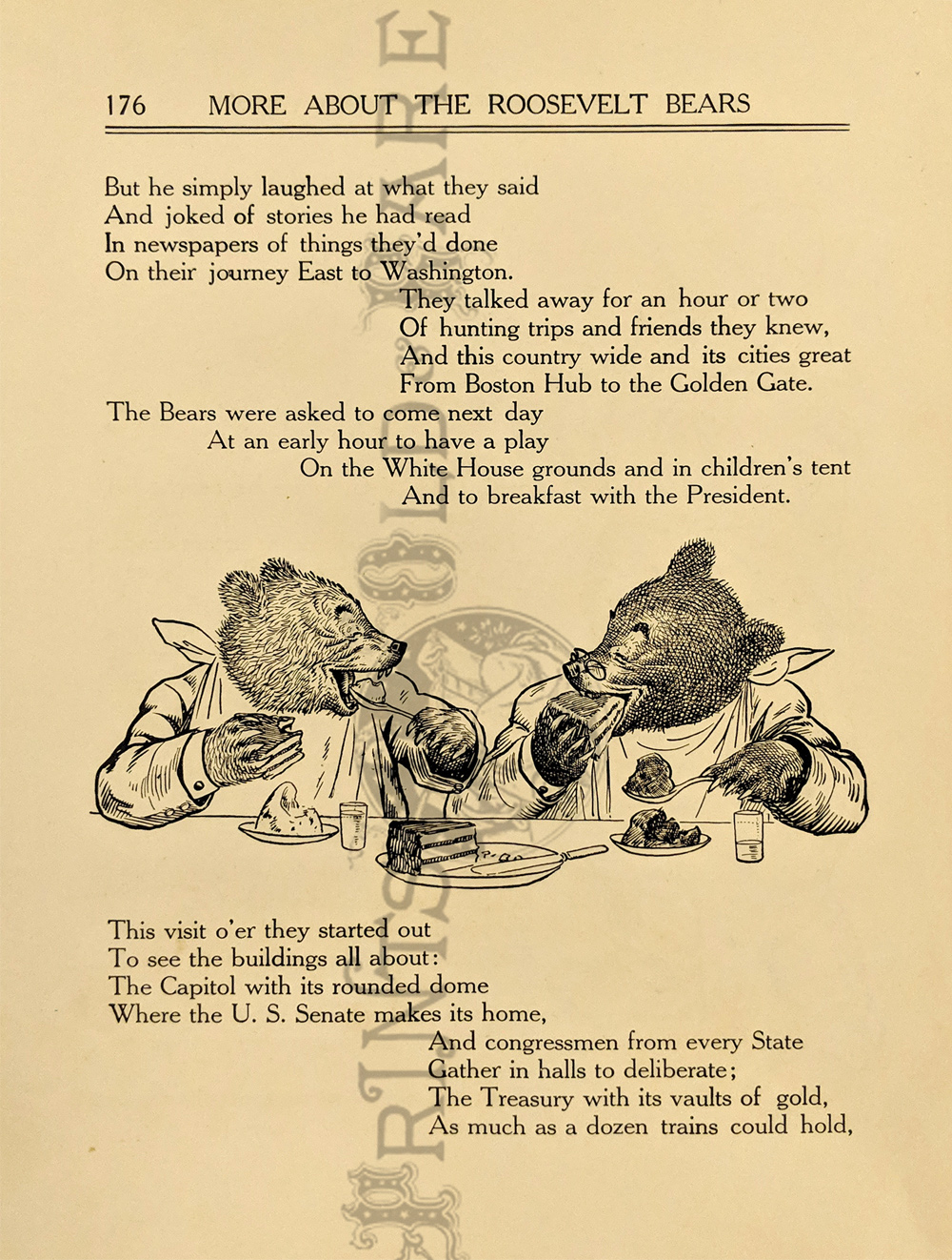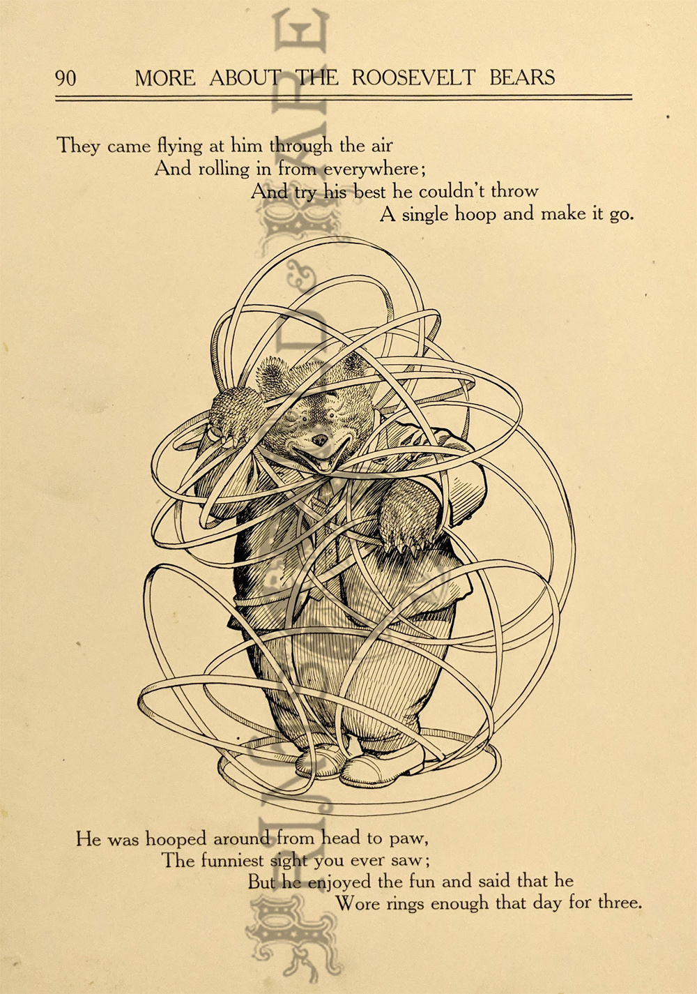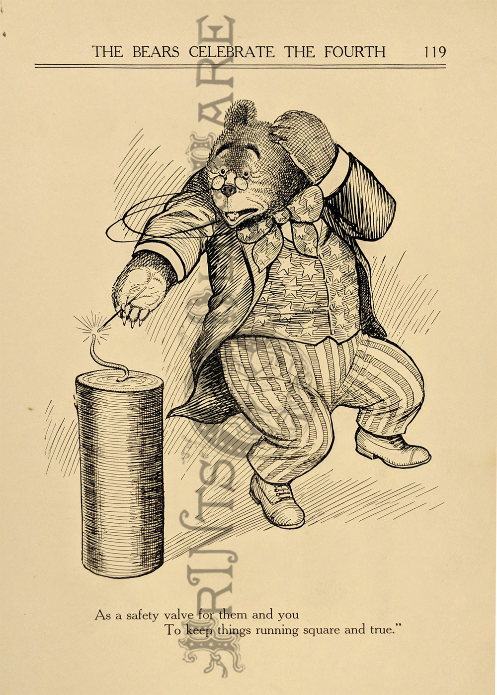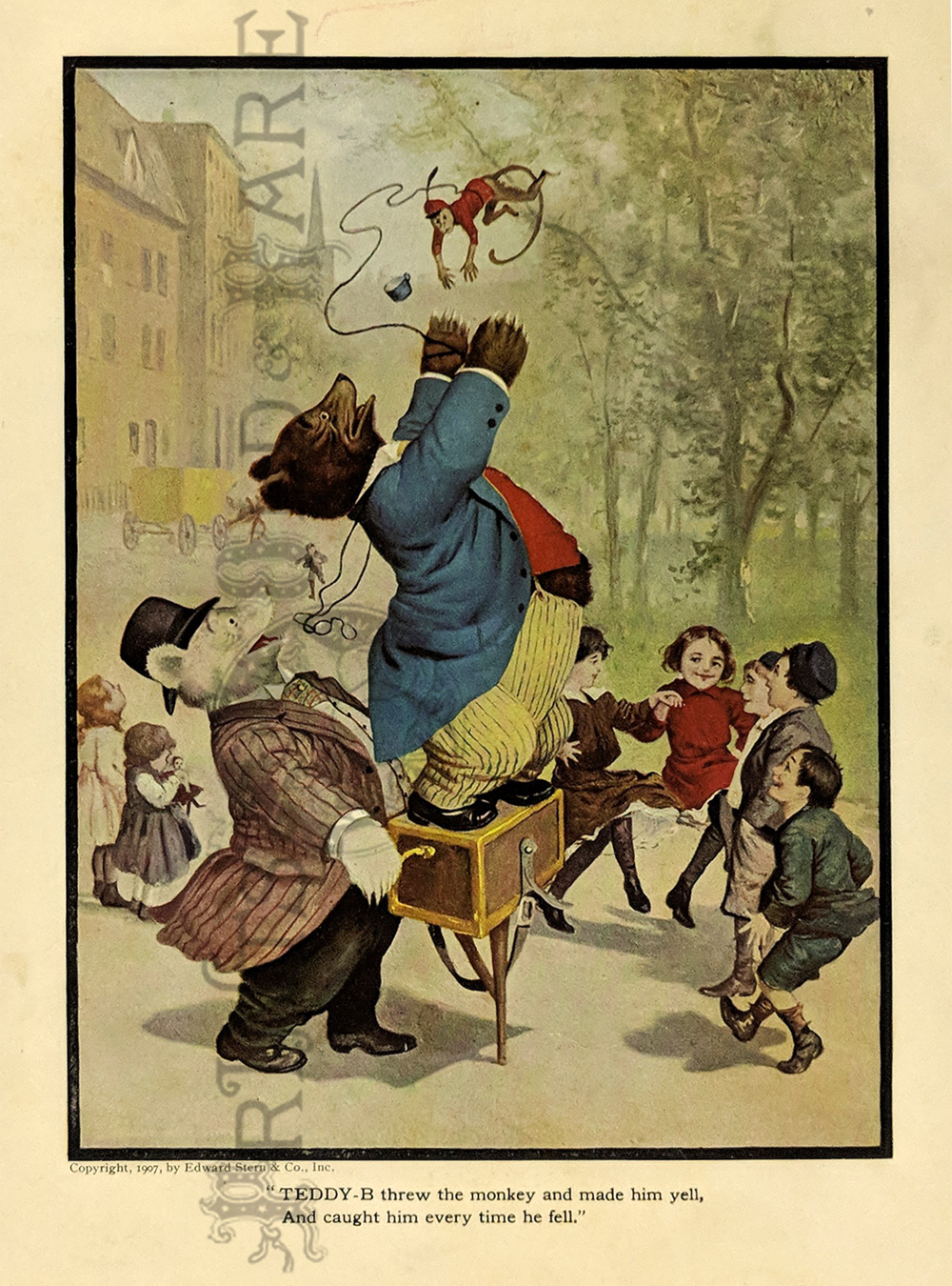 "The Roosevelt Bears" Drawings and verse about two bears (TEDDY-G & TEDDY-B.) who traveled east to see President Theodore Roosevelt. Only two years before, Roosevelt, amused by a cartoon showing him refusing to shoot a bear, had given permission for his name to be used for a new toy, the "Teddy Bear." ![]() 087ted: "TEDDY-B threw the monkey and made him yell, And caught him every time he fell." 1907 Edward Sten & Co. 8 1/8 x 11 in. $40 ![]() 088ted: "We've sailed before, said TEDDY-B, 'We hit Chicago down a tree.'" 1907 Edward Sten & Co. 8 1/8 x 11 in. $40 ![]() 089ted: "'You mind these things,' said TEDDY-G, 'Our breakfast hour is half-past three.'" 1907 Edward Sten & Co. 8 1/8 x 11 in. $40 ![]() 090ted: "'But the play that caused the biggest laugh Was TEDDY-G on a big giraffe.'" 1907 Edward Sten & Co. 8 1/8 x 11 in. $40 ![]() 091ted: "In timing hits and in making base, And in running home in the wildest race, This play that day of the Roosevelt Bears Beat base records everywheres." 1907 Edward Sten & Co. 8 1/8 x 11 in. $30 ![]() 092ted: "They came from the clouds like sailors bold, with not a thing but the rope to hold." 1907 Edward Sten & Co. 8 1/8 x 11 in. $30 ![]() 094ted: "The Bears Celebrate the Fourth" 1907 Edward Sten & Co. 8 1/8 x 11 in. $30 ![]() 095ted: "The Bears Celebrate the Fourth" - "With a slap and bang, in smoke and noise, Like any two July Fourth boys." 1907 Edward Sten & Co. 8 1/8 x 11 in. $30 ![]() 096ted: They looked so jolly and smiled so sweet, That the children clapped and stamped their feet. And waved their hands and stoop on chairs, And cried, "Hurrah for the Roosevelt Bears!" 1907 Edward Sten & Co. 8 1/8 x 11 in. $30 ![]() 097ted: The Bears Celebrate the Fourth. "Shot rockets just to try, To hit the things up in the sky." 1907 Edward Sten & Co. 8 1/8 x 11 in. $30 ![]() 098ted: The Roosevelt Bears visit Washington - "Dee-lighted."1907 Edward Sten & Co. 8 1/8 x 11 in. $30 ![]() 099ted: "The Bears were asked to come next day, At an early hour to have a play, On the White House grounds and in children's tent and breafast with the President." 1907 Edward Sten & Co. 8 1/8 x 11 in. $30 ![]() 100ted: More About the Roosevelt Bears - "And boys and girls wave their good-byes. And tears filled many children's eyes." 1907 Edward Sten & Co. 8 1/8 x 11 in. $30 ![]() 101ted: More About the Roosevelt Bears - "A trunk was brought, a solid mass, With iron locks and bound in brass." 1907 Edward Sten & Co. 8 1/8 x 11 in. $30 ![]() 102ted: The Roosevelt Bears play Baseball - "The Bears were invited by Muddy Pete, to go with him to an East Side street." 1907 Edward Sten & Co. 8 1/8 x 11 in. $30 ![]() 103ted: The Bears Celebrate the Fourth - "As a safety valve for them and you, To keep things running square and true." 1907 Edward Sten & Co. 8 1/8 x 11 in. $30 ![]() 104ted: More About the Roosevelt Bears - "They breakfasted the following day, With the President and had their play." 1907 Edward Sten & Co. 8 1/8 x 11 in. $30 ![]() 105ted: More About the Roosevelt Bears - "He was hooped around from head to paw, The funniest sight you ever saw." 1907 Edward Sten & Co. 8 1/8 x 11 in. $30 ![]() 107ted: The Bears Entertain Philadelphia Children - "And through the halls walked round and round, But not a trace of the Bears they found." 1907 Edward Sten & Co. 8 1/8 x 11 in. $20 ![]() 108ted: "Big Teddy Bear For You." Cute advertisement for the Teddy Bear & The Whole Bear Family. They are all the rage! 7 x 10 in. $40 ![]() 109ted: "They strung a wire from tree to tree and then the fellows with TEDDY-B, Put crackers all along the wire, to prepare the field fro an army fire." 1907 Edward Sten & Co. 8 1/8 x 11 in. $30 |