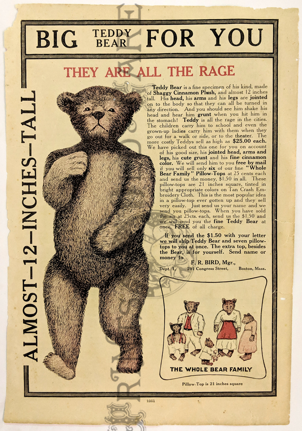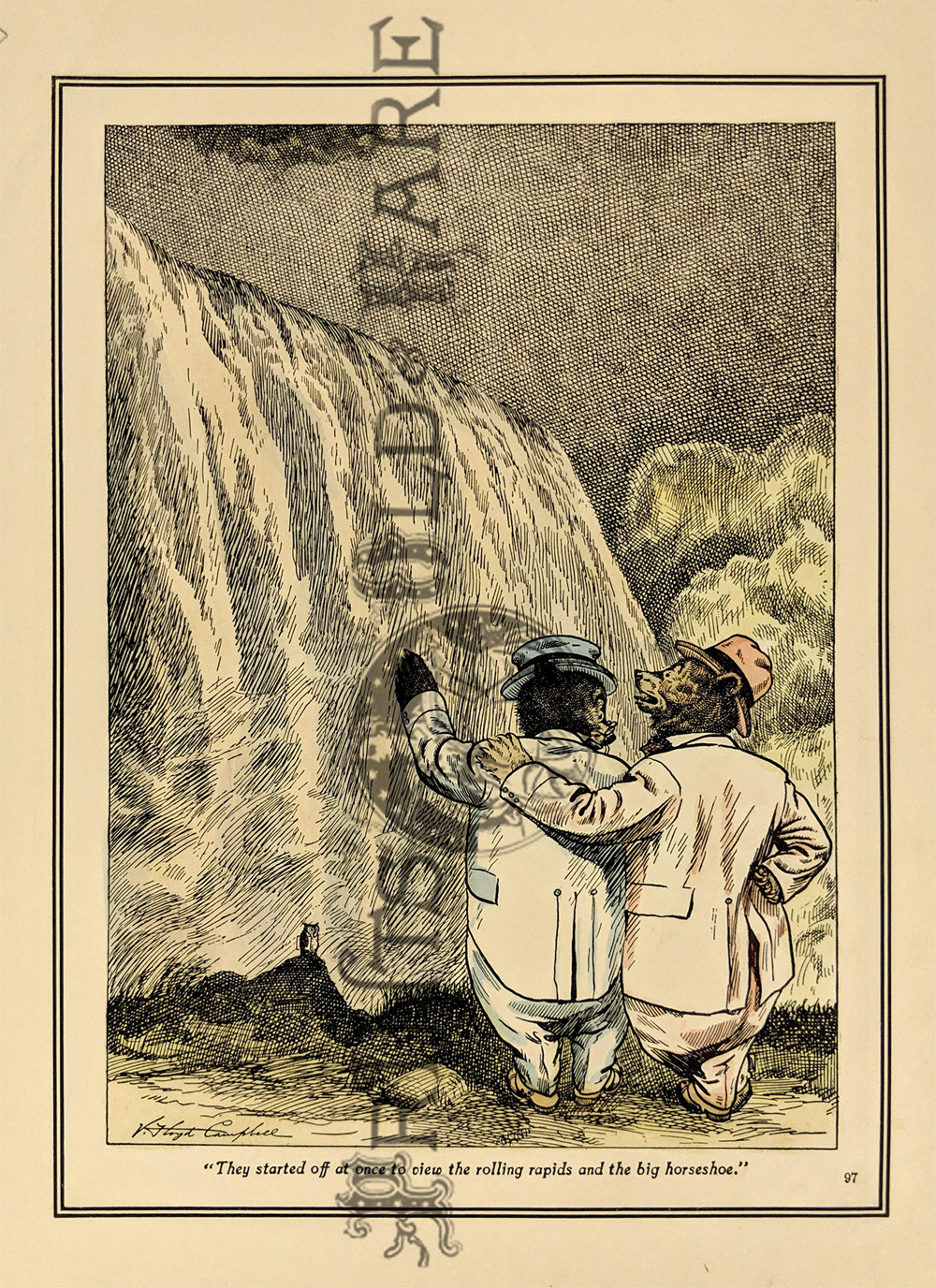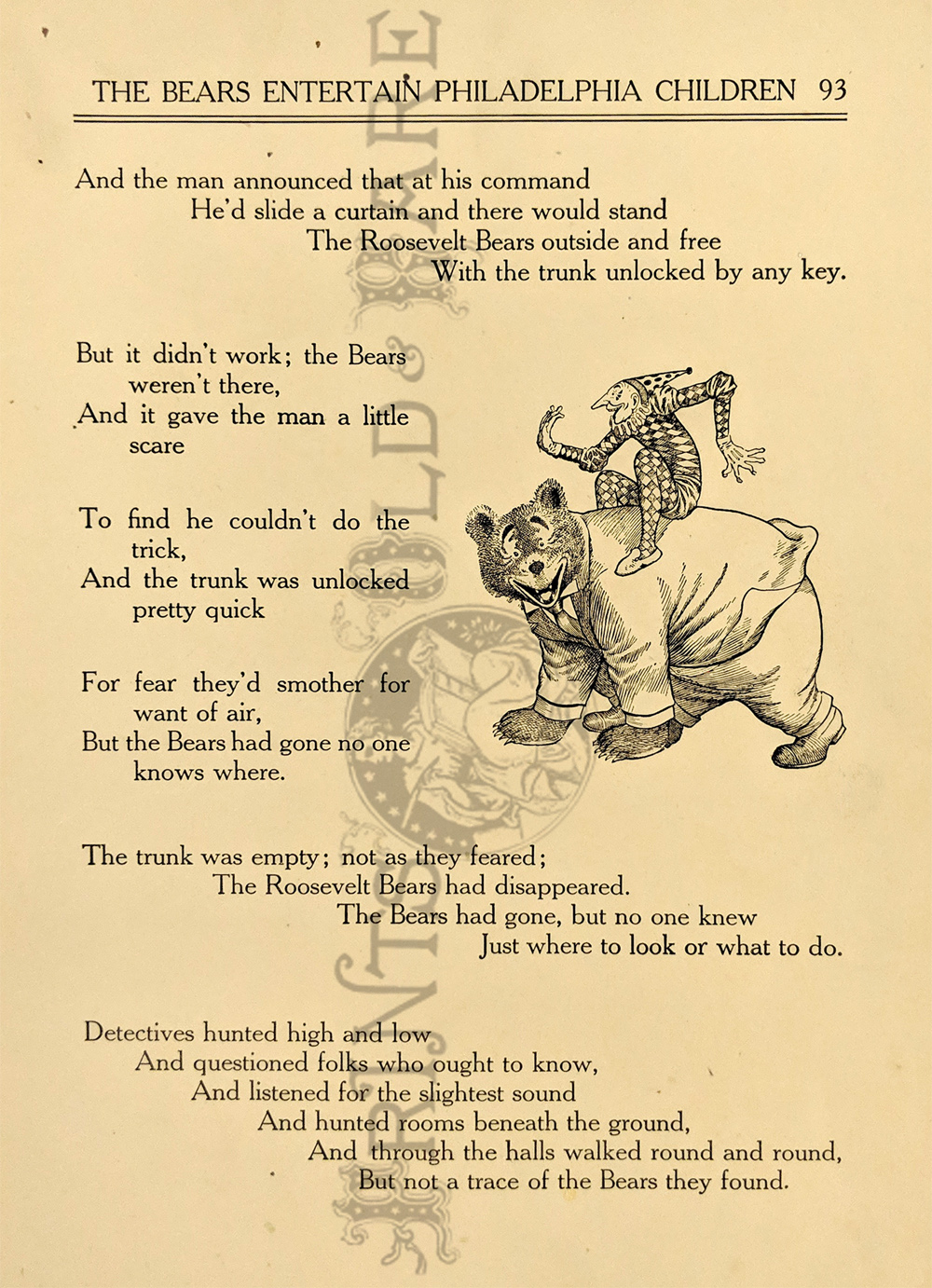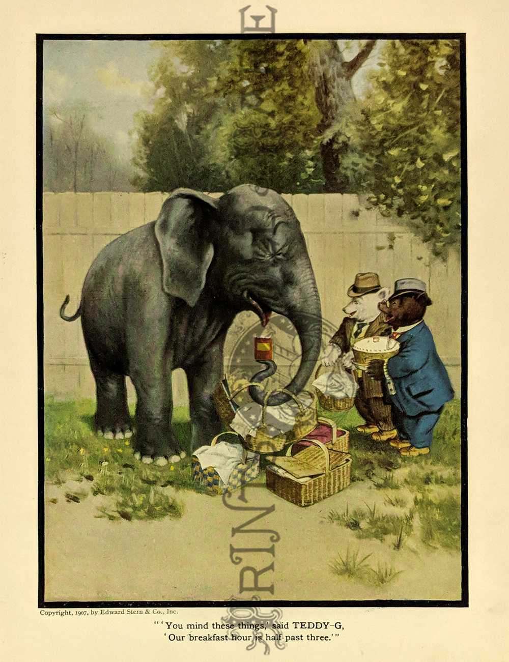 "The Roosevelt Bears" Drawings and verse about two bears (TEDDY-G & TEDDY-B.) who traveled east to see President Theodore Roosevelt. Only two years before, Roosevelt, amused by a cartoon showing him refusing to shoot a bear, had given permission for his name to be used for a new toy, the "Teddy Bear." ![]() 087ted: "TEDDY-B threw the monkey and made him yell, And caught him every time he fell." 1907 Edward Sten & Co. 8 1/8 x 11 in. $40 ![]() 088ted: "We've sailed before, said TEDDY-B, 'We hit Chicago down a tree.'" 1907 Edward Sten & Co. 8 1/8 x 11 in. $40 ![]() 089ted: "'You mind these things,' said TEDDY-G, 'Our breakfast hour is half-past three.'" 1907 Edward Sten & Co. 8 1/8 x 11 in. $40 ![]() 090ted: "'But the play that caused the biggest laugh Was TEDDY-G on a big giraffe.'" 1907 Edward Sten & Co. 8 1/8 x 11 in. $40 ![]() 091ted: "In timing hits and in making base, And in running home in the wildest race, This play that day of the Roosevelt Bears Beat base records everywheres." 1907 Edward Sten & Co. 8 1/8 x 11 in. $30 ![]() 092ted: "They came from the clouds like sailors bold, with not a thing but the rope to hold." 1907 Edward Sten & Co. 8 1/8 x 11 in. $30 ![]() 094ted: "The Bears Celebrate the Fourth" 1907 Edward Sten & Co. 8 1/8 x 11 in. $30 ![]() 095ted: "The Bears Celebrate the Fourth" - "With a slap and bang, in smoke and noise, Like any two July Fourth boys." 1907 Edward Sten & Co. 8 1/8 x 11 in. $30 ![]() 096ted: They looked so jolly and smiled so sweet, That the children clapped and stamped their feet. And waved their hands and stoop on chairs, And cried, "Hurrah for the Roosevelt Bears!" 1907 Edward Sten & Co. 8 1/8 x 11 in. $30 ![]() 097ted: The Bears Celebrate the Fourth. "Shot rockets just to try, To hit the things up in the sky." 1907 Edward Sten & Co. 8 1/8 x 11 in. $30 ![]() 098ted: The Roosevelt Bears visit Washington - "Dee-lighted."1907 Edward Sten & Co. 8 1/8 x 11 in. $30 ![]() 099ted: "The Bears were asked to come next day, At an early hour to have a play, On the White House grounds and in children's tent and breafast with the President." 1907 Edward Sten & Co. 8 1/8 x 11 in. $30 ![]() 100ted: More About the Roosevelt Bears - "And boys and girls wave their good-byes. And tears filled many children's eyes." 1907 Edward Sten & Co. 8 1/8 x 11 in. $30 ![]() 101ted: More About the Roosevelt Bears - "A trunk was brought, a solid mass, With iron locks and bound in brass." 1907 Edward Sten & Co. 8 1/8 x 11 in. $30 ![]() 102ted: The Roosevelt Bears play Baseball - "The Bears were invited by Muddy Pete, to go with him to an East Side street." 1907 Edward Sten & Co. 8 1/8 x 11 in. $30 ![]() 103ted: The Bears Celebrate the Fourth - "As a safety valve for them and you, To keep things running square and true." 1907 Edward Sten & Co. 8 1/8 x 11 in. $30 ![]() 104ted: More About the Roosevelt Bears - "They breakfasted the following day, With the President and had their play." 1907 Edward Sten & Co. 8 1/8 x 11 in. $30 ![]() 105ted: More About the Roosevelt Bears - "He was hooped around from head to paw, The funniest sight you ever saw." 1907 Edward Sten & Co. 8 1/8 x 11 in. $30 ![]() 107ted: The Bears Entertain Philadelphia Children - "And through the halls walked round and round, But not a trace of the Bears they found." 1907 Edward Sten & Co. 8 1/8 x 11 in. $20 ![]() 108ted: "Big Teddy Bear For You." Cute advertisement for the Teddy Bear & The Whole Bear Family. They are all the rage! 7 x 10 in. $40 ![]() 109ted: "They strung a wire from tree to tree and then the fellows with TEDDY-B, Put crackers all along the wire, to prepare the field fro an army fire." 1907 Edward Sten & Co. 8 1/8 x 11 in. $30 |