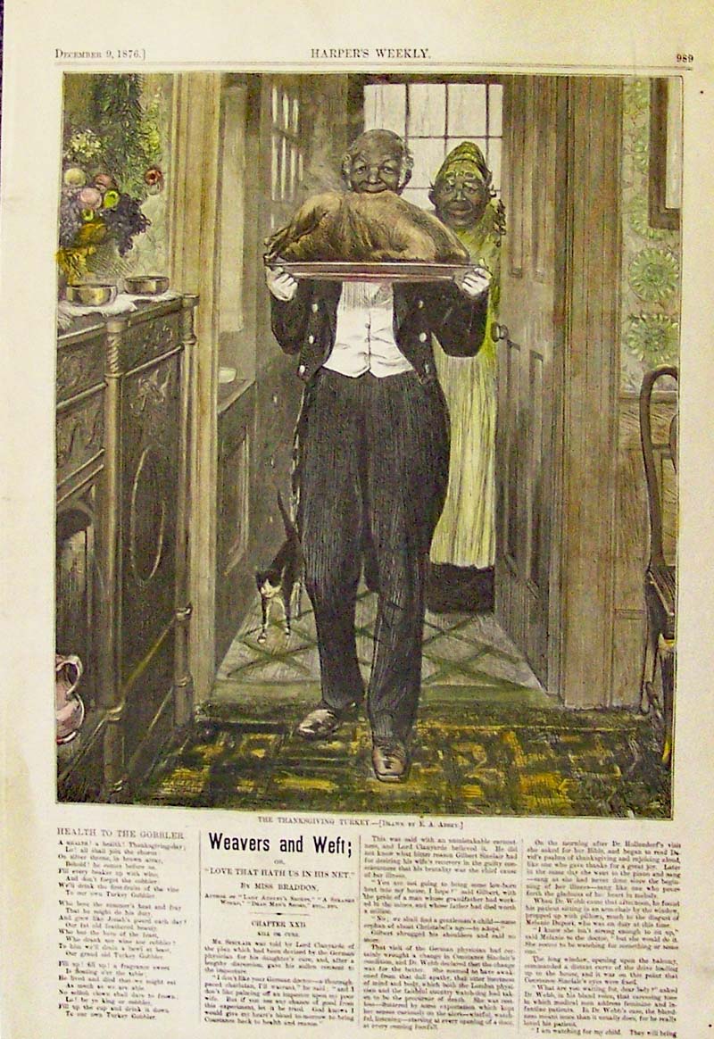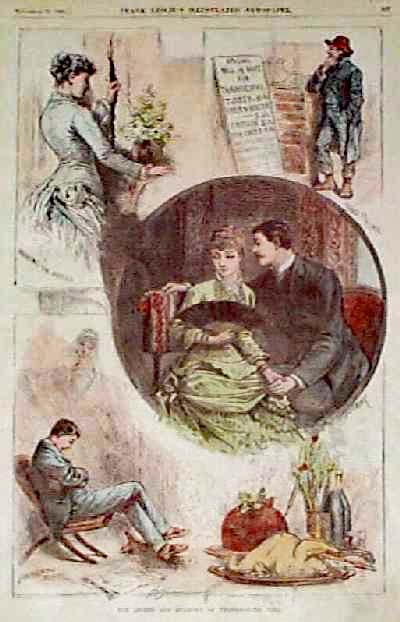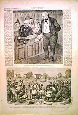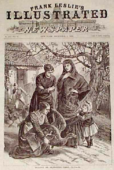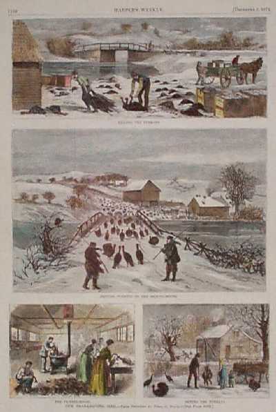 ![]() 001thnk: 1901 Leslie's Weekly color half-tone cover titled, "The Teacher's Thanksgiving Gift." 15-1/2 x 10-1/2 in. $50 ![]() 003thnk: 1871: Preparing Turkeys for Thanksgiving. Four hand colored, engraved scenes from Harper's Weekly. Title is "Our Thanksgiving Bird." Shows turkeys being brought to the slaughter house, killed and processed for cooking. 11x16 in. $50 ![]() 005thnk: 1880 Thanksgiving Turkey Selection. Engraved image from Frank Leslie's Illustrated Newspaper, titled "Selecting the Thanksgiving Turkey." Shows women and children on a farm, inspecting a turkey which is about to become dinner. 11x16 in. $30 ![]() 107bh: 1876 Harper's Weekly hand colored wood engraving titled, "The Thanksgiving Turkey." 16 x 11 in. $40 . ![]() 009thnk: 1871 New England Farm Thanksgiving. Hand colored engraving from Harper's Weekly, showing a large family seated around a farmhouse table for their Thanksgiving feast. 11x16 in. $50 |