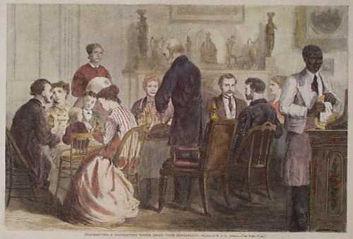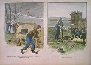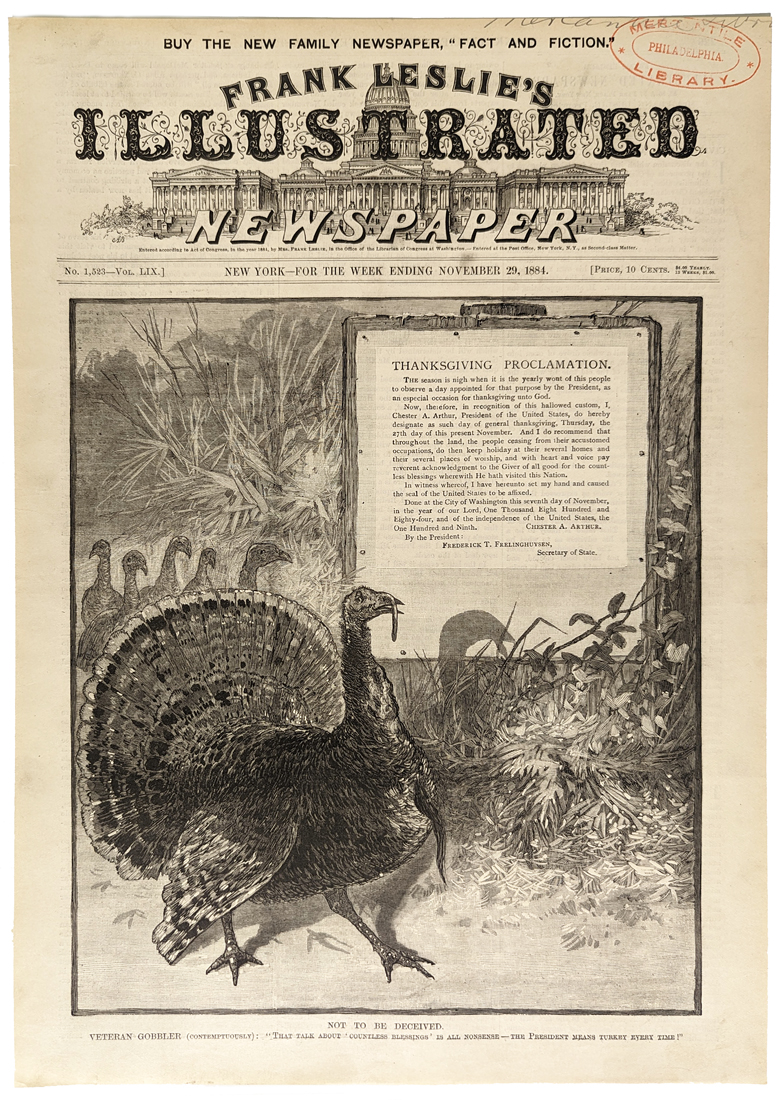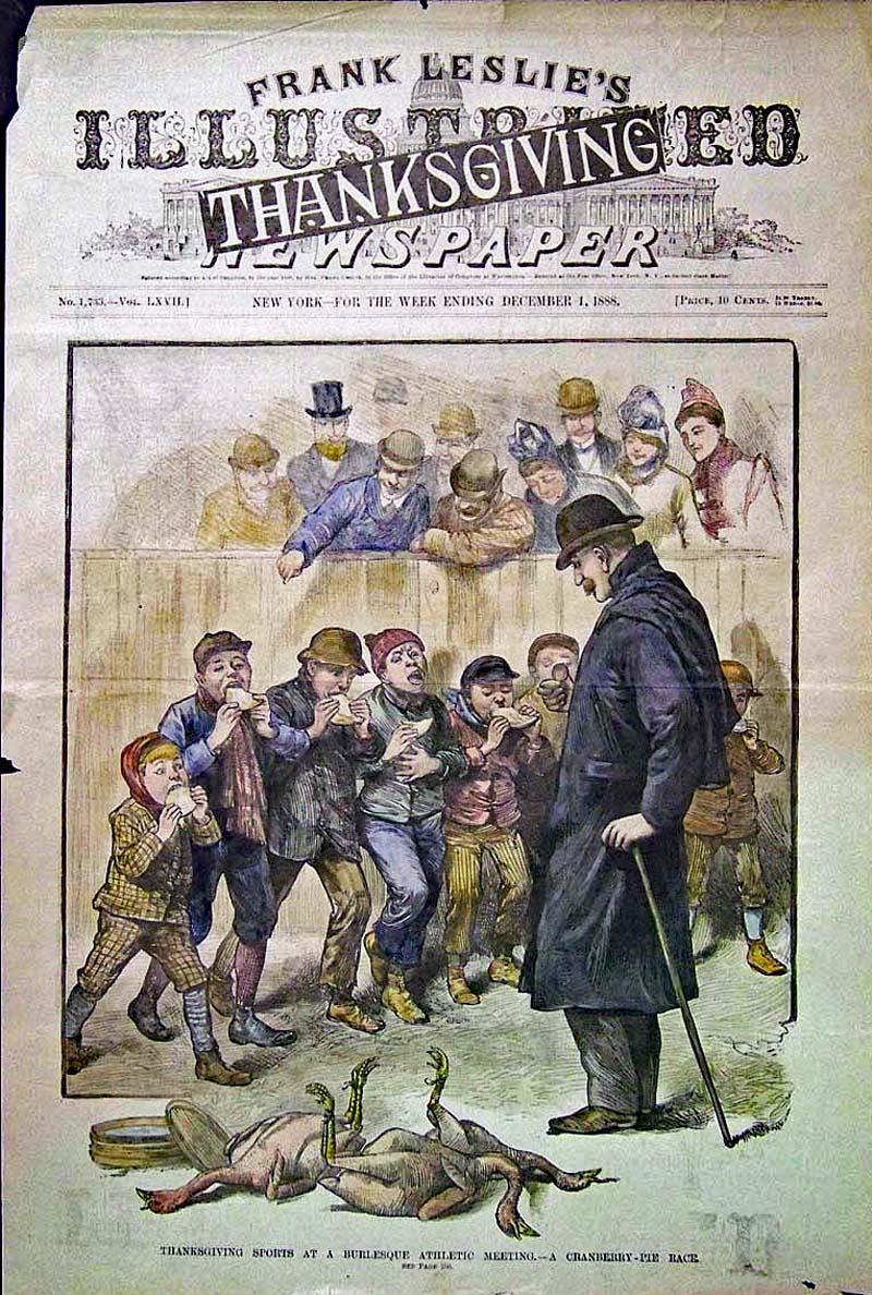 ![]() 022thnk: Harper's Weekly Supplement from November 30, 1872. Top Picture entitled "The Cheerful Giver" drawn by C.S. Reinhart, From a sketch by Thomas Worth. Lower Picture, "The Turkeys' Revolt Against Thanksgiving." Drawn by F.S. Church. 11x16 in. $20 ![]() 023thnk: Thanksgiving - A Thanksgiving Dinner Among the Puritans. Hand colored engraving drawn by J.W. Ehninger. Featured in Harper's Weekly. 11x16 in. $40 ![]() 024thnk: 1888 Hand colored wood engraving showing a Cranberry Pie Race "Burlesque Athletic Meeting." Image shows boys lined up in pie-eating contest. Featured in a Thanksgiving issue of Frank Leslie's Illustrated Weekly. 16 x 11 in. $50 ![]() 025thnk: Thanksgiving Day: Ways and Means / Arrival at the Old House. 1858 Harper's Weekly. Wood engraving. 16 x 11 in. $60 ![]() 026thnk: Our National Thanksgiving. 1866 Frank Leslies'. Hnad colored, wood engraving. 6 vignettes depicting the different Thanksgiving festivities, along with a civil war scene. 16 x 22 in. $120 ![]() 027thnk: Not To Be Deceived. Verteran Gobbler (Contemptuously) "That talk about 'countless blessings' is all nonsense - The President means Turkey every time!" 1884 Frank Leslie's. Wood engraving. 160 7/8 x 15 3/4 in. $60 |