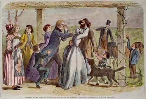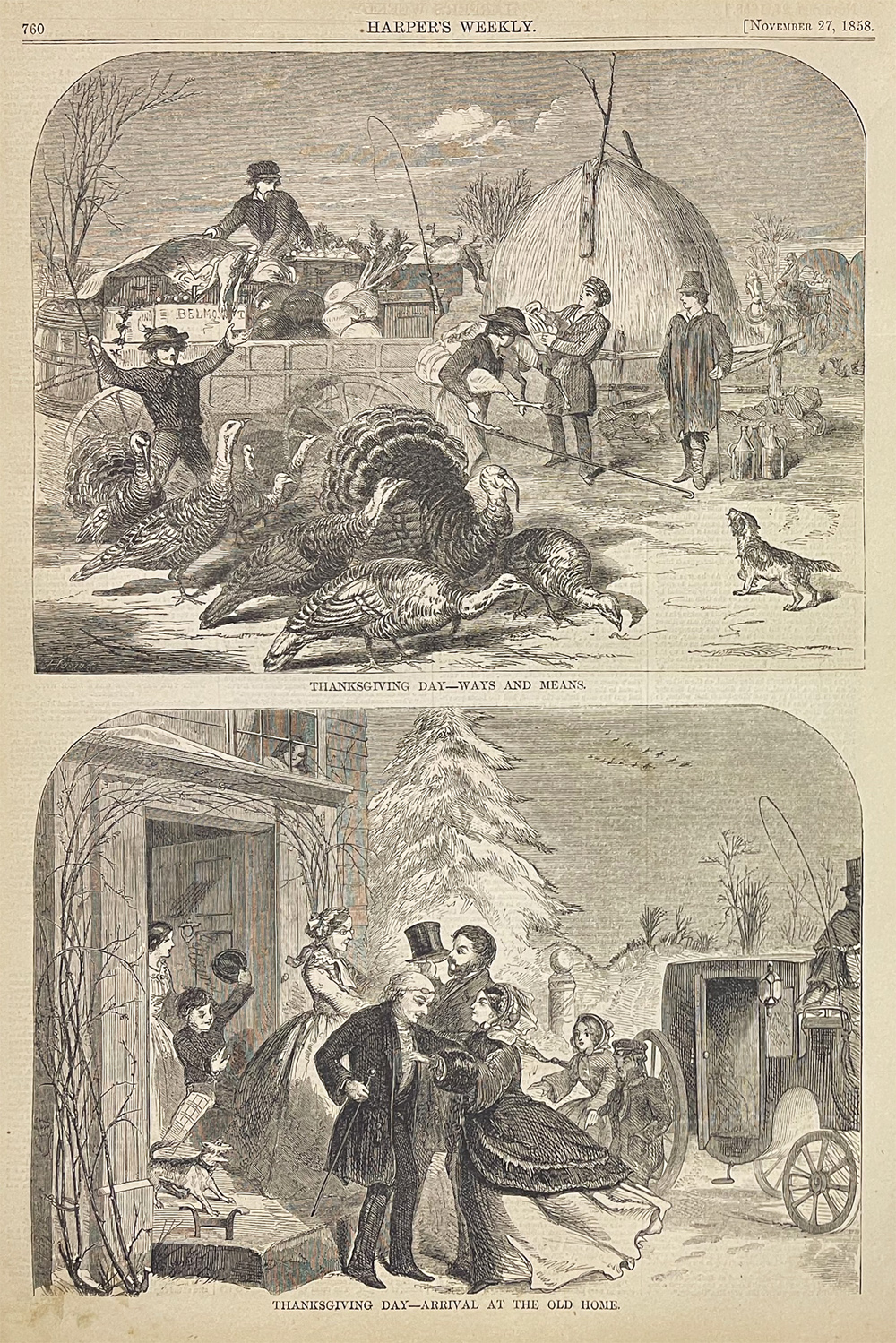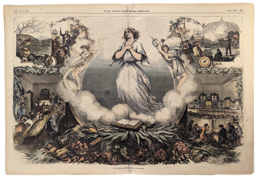 ![]() 011thnk: 1867 Thanksgiving for Puritan Descendants. Hand colored engraving from Harper's Weekly, titled "Thanksgiving: A Thanksgiving Dinner Among Their Descendants." Shows a stern-looking, formal family seated around the table for their feast. 11x16 in. $50 ![]() 012thnk: 1860: Old Homestead on Thanksgiving Day. Hand colored engraving from the New York Illustrated News, titled "Gathering of the Family on Thanksgiving Day at the Old Homestead. Unexpected Appearance of One from California." Touching family reunion scene. 11x16 in. $50 ![]() 015thnk: 1885 Thanksgiving Scenes. Hand colored engraving from Frank Leslie's Illustrated Newspaper, titled "The Lights and Shadows of Thanksgiving Time." Shows several typical Thanksgiving scenes: a woman waiting for guests to arrive, a tramp reading a restaurant menu, a young couple in love, etc. 11x16 in. $50 ![]() 018thnk: 1888: Two hand colored Thanksgiving engravings from Frank Leslie's Illustrated. The two illustrations show: The Stolen Goose or the Consequences of Gossiping, and With the Cowboys- Preparing for Thanksgiving: Making Pies. 11x16 in. $60 ![]() 021thnk: Hand colored engravings showing four scenes of turkey hunting. From Frank Leslie's Illustrated Newspaper. "On the Eve of the Thanksgiving Feast. - Hunting the Wild Turkey." 11x16 in. $50 ![]() 200thnk: 1887 Thanksgiving Scene: US Army in the Old West. Engraved, hand-colored scene from Harpers Weekly. Title is Cause for Thanksgiving. Four hungry soldiers are shown gathered around a small campfire, as their comrades approach with food. Several professional repairs made to center crease, barely noticeable. Overall fine condition. 16x22 in. $80 Check for Availability |