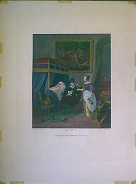 013alco: Circa 1860 Wine: Une Jeune Femme Malade. This beautiful hand colored engraving depicts a sick young lady being given wine for her malady. This engraving was done by Avril Pere which was copied from a painting by J. Steen. Size 22.5x17 in. $250