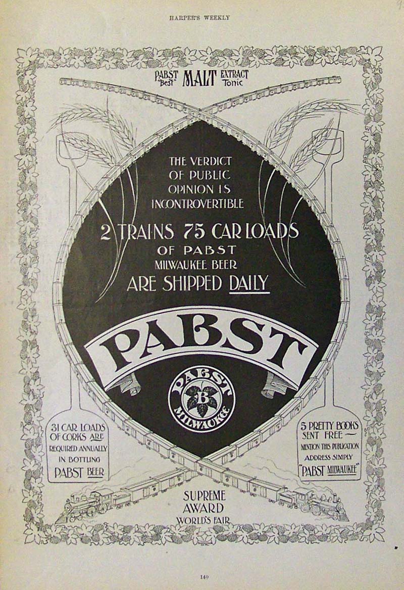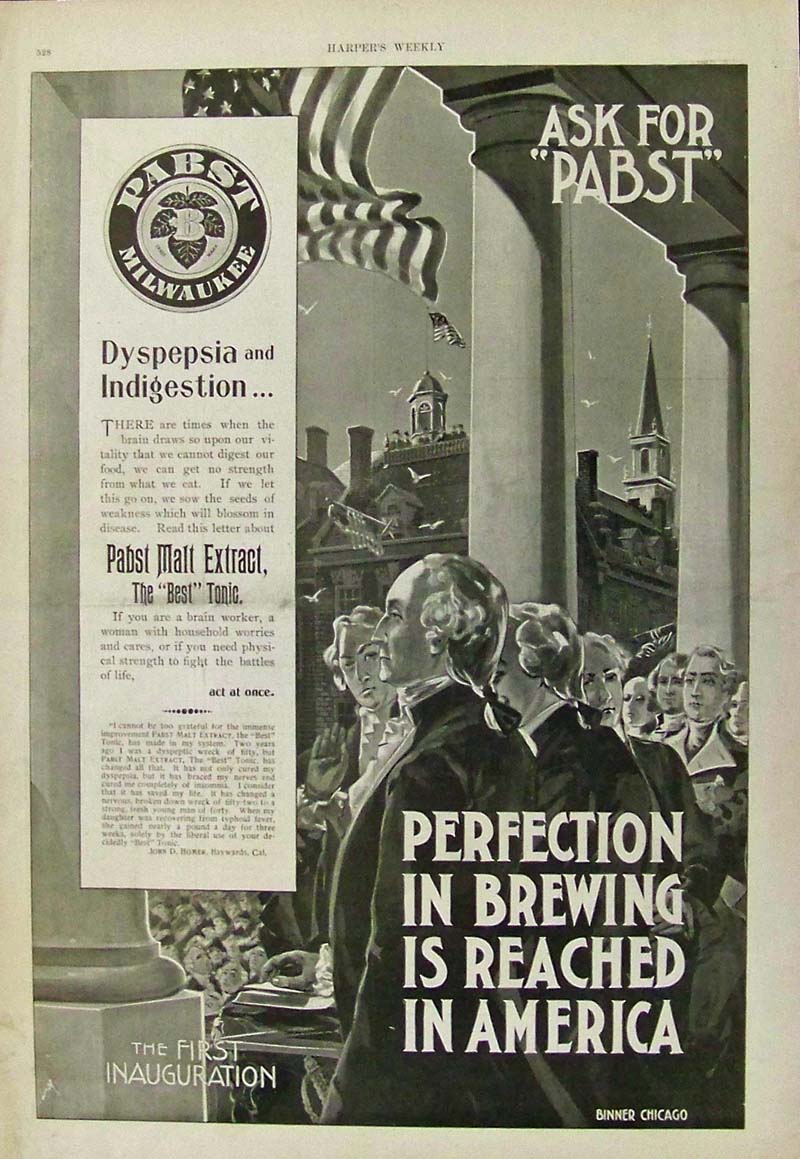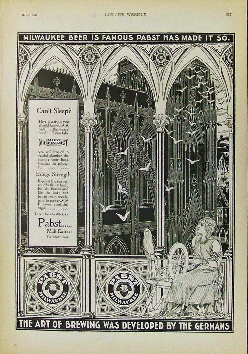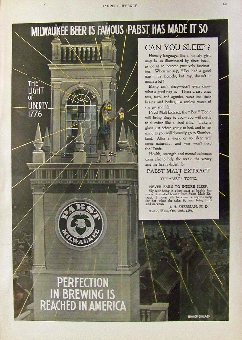 016alco: 1897 Harper's Weekly Pabst Milwaukee Beer advertisement -- Perfection is Brewing is Reached in America. This Pabst Malt Extract was the best "tonic" for helping one sleep. 15-1/2 x 10-1/2 in. $60