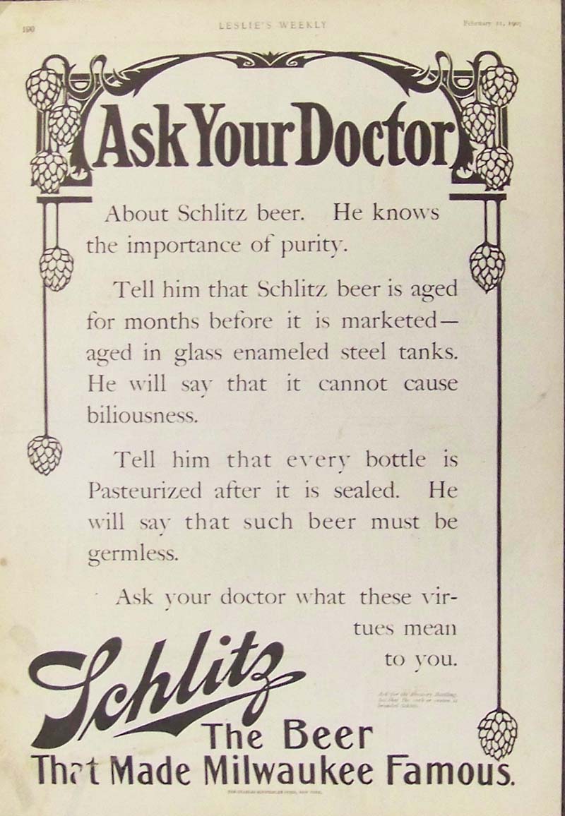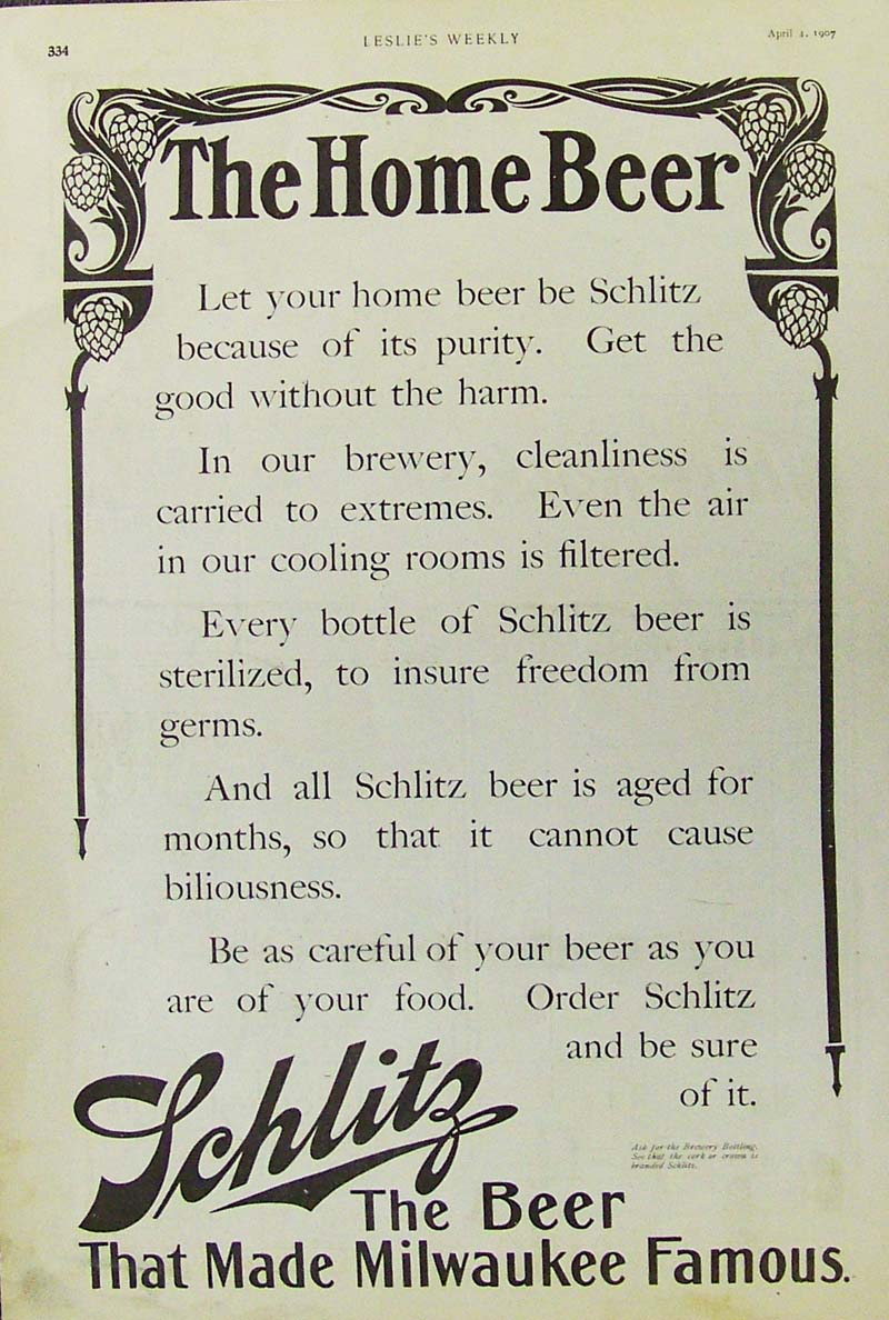017alco: 1907 Leslie's Weekly advertisement for Schlitz Beer, the pure beer that made Milwaukee famous. 15-1/2 x 10-1/2 in. $30