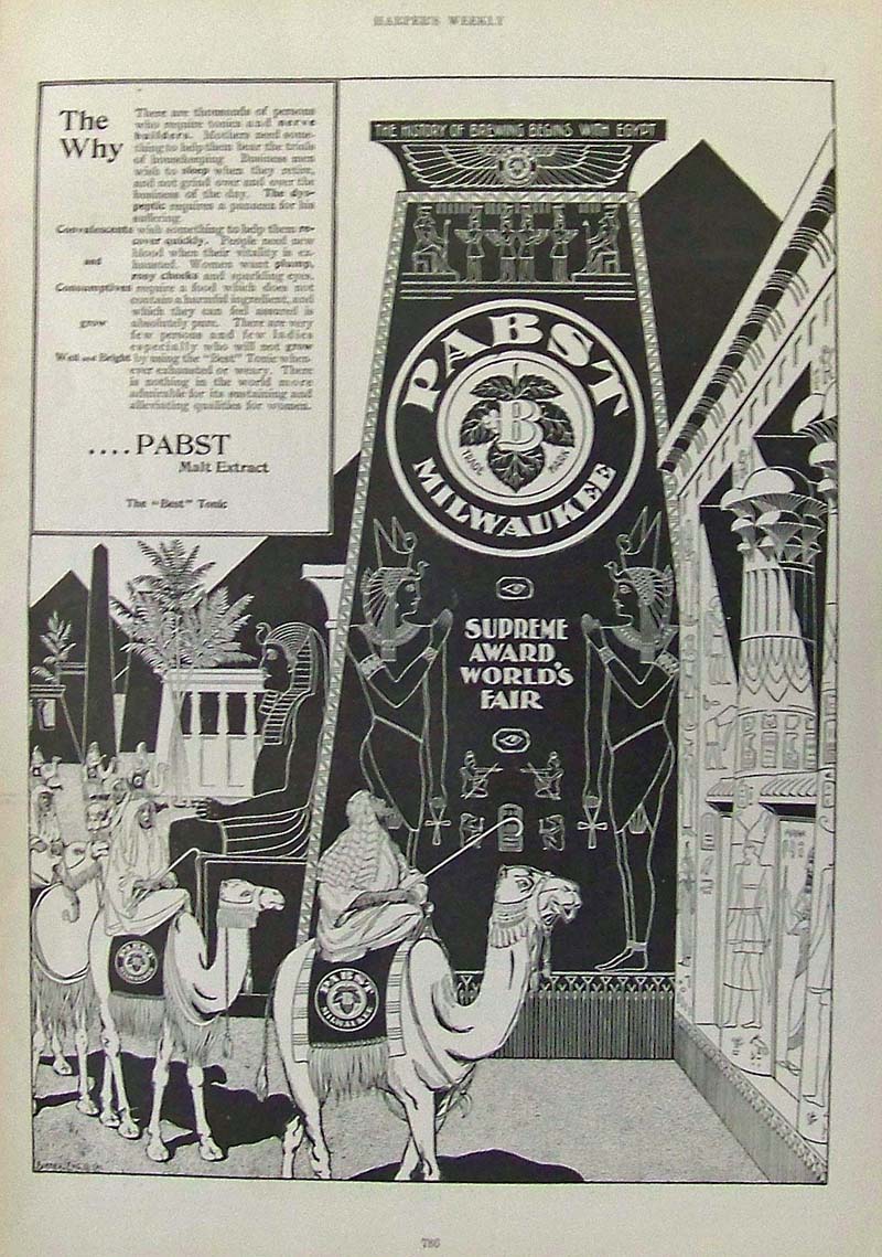 018alco: 1895 Harper's Weekly advertisement for Pabst Malt Extract of Milwaukee, showing their Supreme Award at the World's Fair as robed men on camels stroll by. 15-1/2 x 10-1/2 in. $30