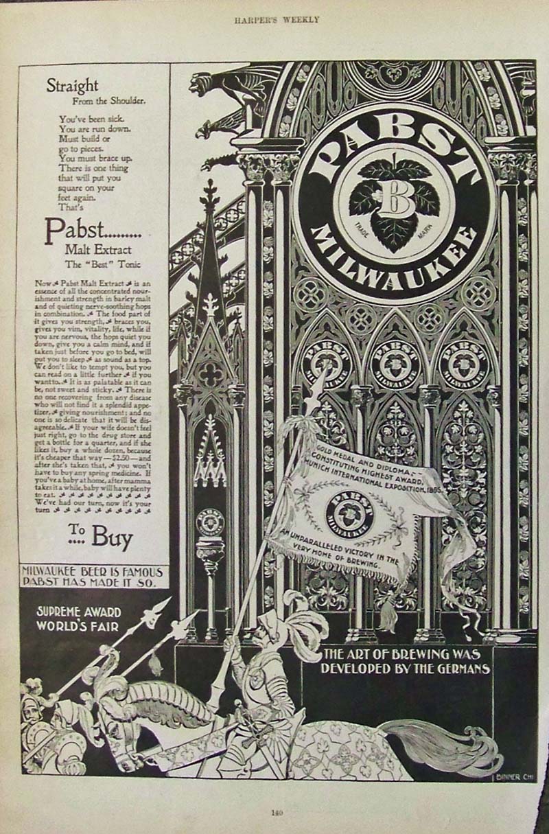 026alco: C.1895 Harper's Weekly advertisement for Pabst Malt Extract, perfected by the Germans -- An Unparalleled Victory in the Very Home of Brewing. 15-1/2 x 10 in. $30