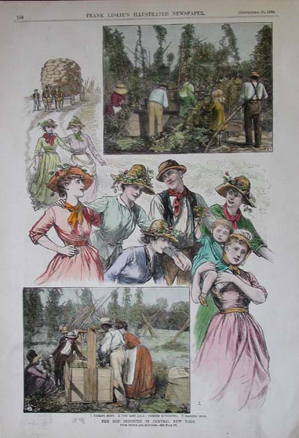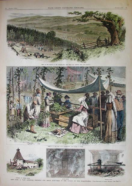 012alco: 1881 Beer: Hop Fields in New York State. Nicely hand colored engraving from Harper's Weekly, titled "In the Hop Fields of Central New York." Contains seven images of workers harvesting hops, and processing them for shipment. 11x16 in. $80