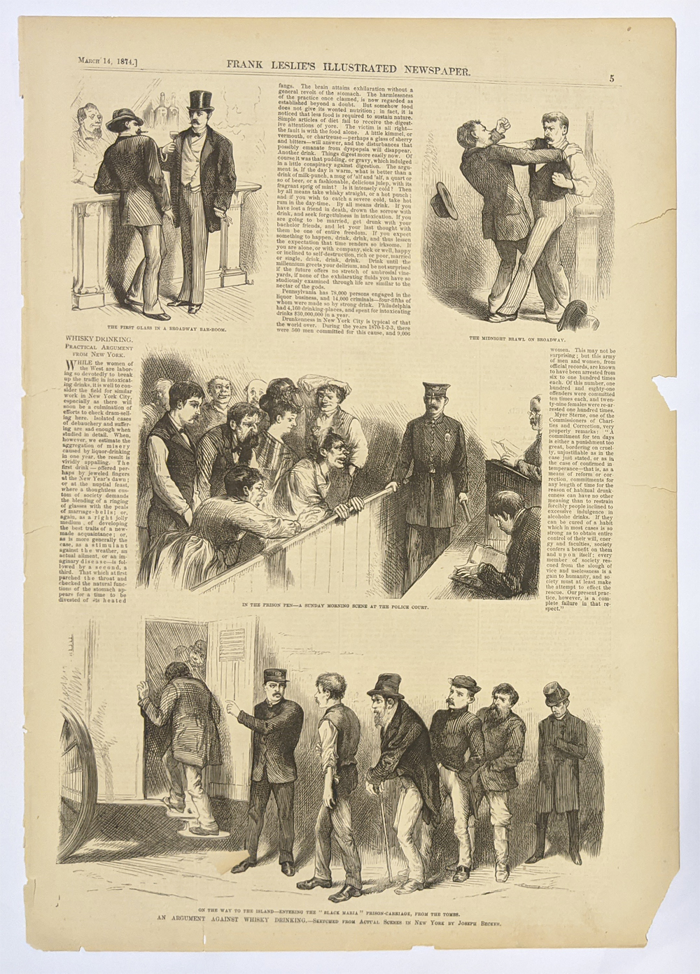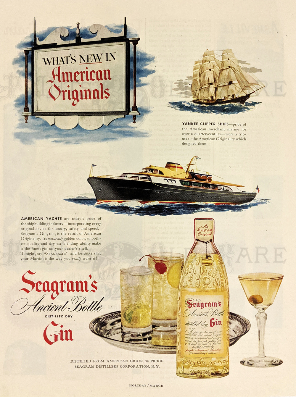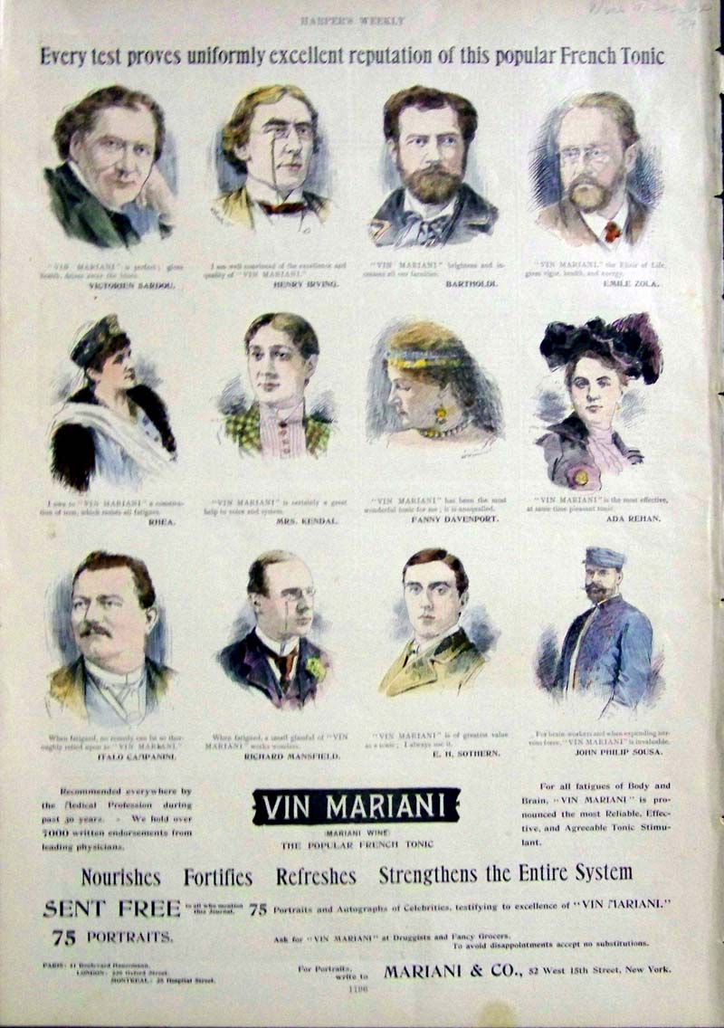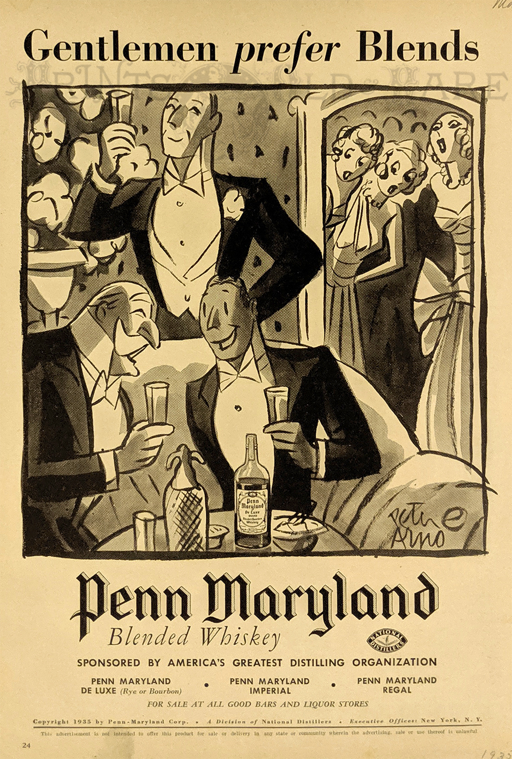 210alco: 1894 Hand colored wood engravings featured in Harper's Weekly advertising "Every test proves uniformly excellent reputation of this popular French Tonic" for Vin Mariani. "Recommended everywhere by the Medical Profession...For all fatigues of Body and Brain." 15-1/2 x 11 in. $40 ![]() 211alco: "Perfection in Brewing is Reached in America." Hand colored Pabst Milwaukee advertisement. Showing a Captain on a small boat pointing the way. "Take up the Slack!" 1896 Harper's Weekly. 16 x 11 in. $60 ![]() 212alco: Large double page print showing the two views of David Jones' Brewery. New Rochelle Lager Bier Brewery and View of David Jones' Ale Brewery, Forty-Fourth Street and First Avenue, New York. Hand colored, wood engraving. 17 x 23 1/2 in. $250 ![]() 213alco: "The Democracy of the Lager Beer. Scene at well-known local bar." 1858 Frank Leslies' German Edition. Hand colored, wood engraving. 11 x 15 in. $60 ![]() 214alco: "Beer Brewing: Gin Day in an American Brewery." Showing 7 various scenes in a brewery. 1873 Frank Leslies' German Edition. Wood engraving. 10 1/2 x 15 in. $60 ![]() 215alco: 1950 Seagram's Ancient Bottle Distilled Dry Gin Ad. Features a Yankee Clipper ship, a super yacht, and cocktails made from Seagram's dry gin. 10 1/2 x 13 in. $30 ![]() 216alco: "Gentlemen prefer Blends." 1935 Penn Maryland Whiskey cartoon advertisement. 8 x 11 1/4 in. $30