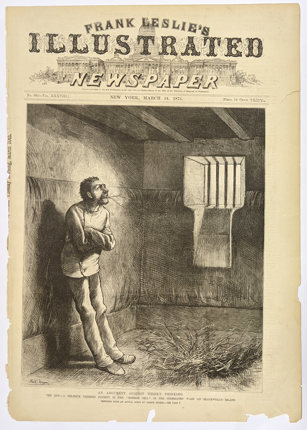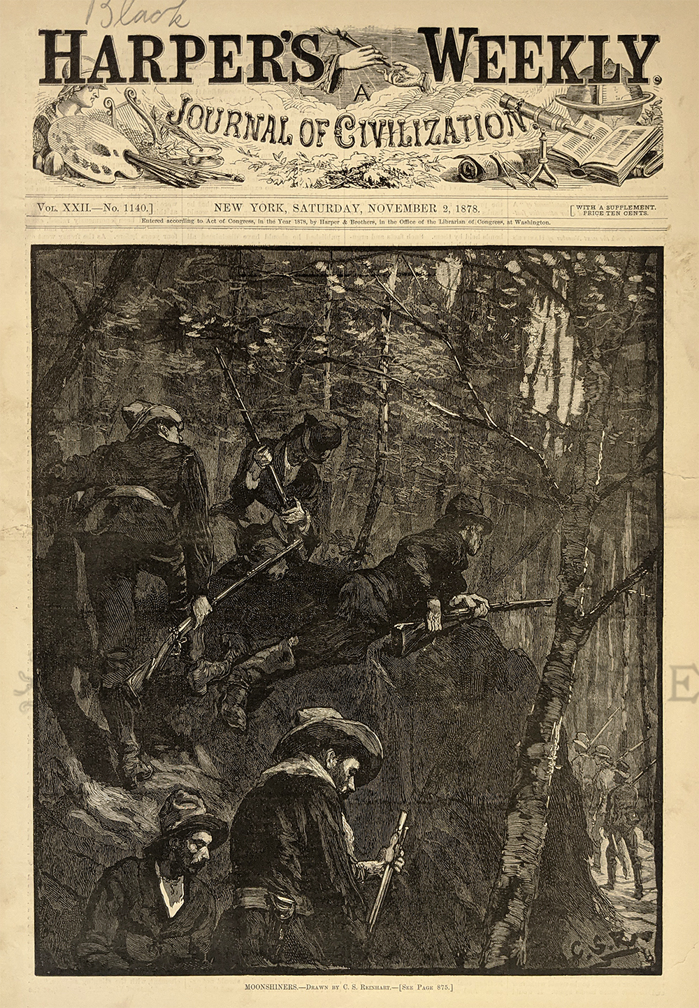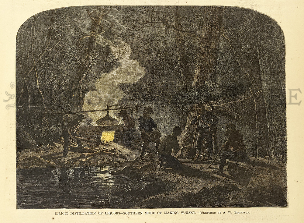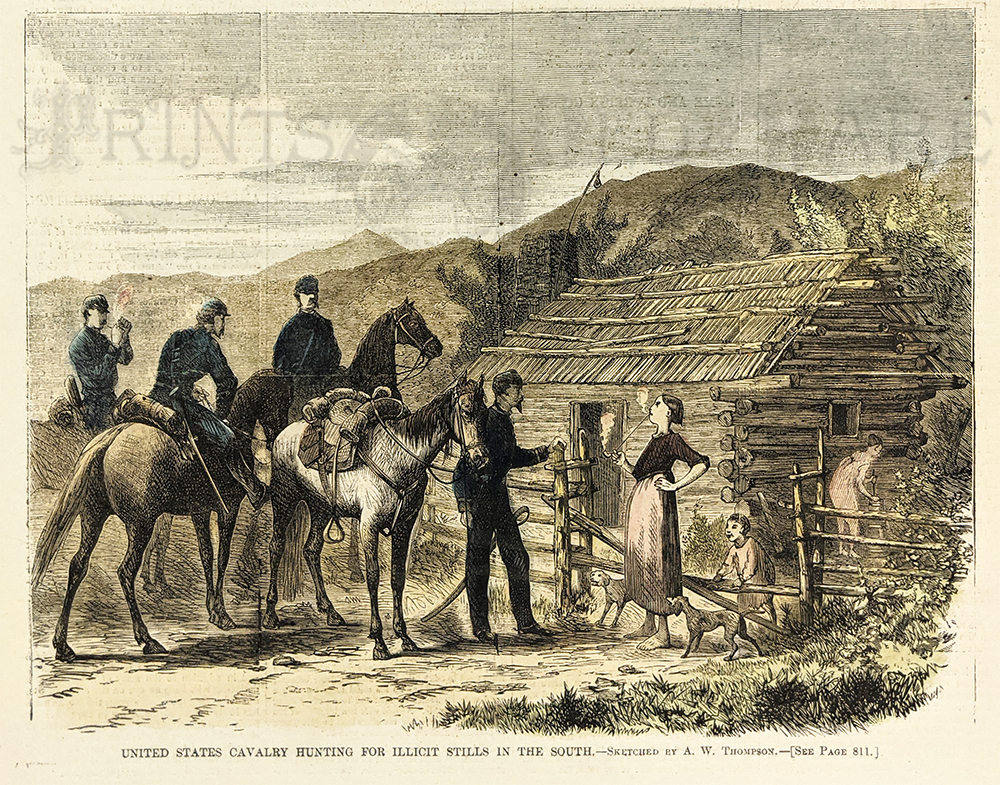024alco: 1897 Harper's Weekly patriotic advertisement for Pabst Milwaukee Malt Extract -- Perfection in Brewing in America, cure for dyspepsia and indigestion. 15-1/2 x 10-1/2 in. $30 ![]() 008tnast: Bar of Destruction -1874 Anti-Alcohol Cartoon wood engraving published in an 1874 issue of Harper's Weekly. The cartoon shows men drinking with a skeleton at a bar. The title reads, "The Bar of Destruction." 11x16 in. Black & White: $40 Hand Colored: $60 ![]() 227sc: 1879 Moonshine: Illicit Distillation of Whiskey - U.S Marshalls Tracking Moonshine. Rare View. Wood engraving from Frank Leslie's Illustrated Newspaper. 16 x 11 in. $80 |