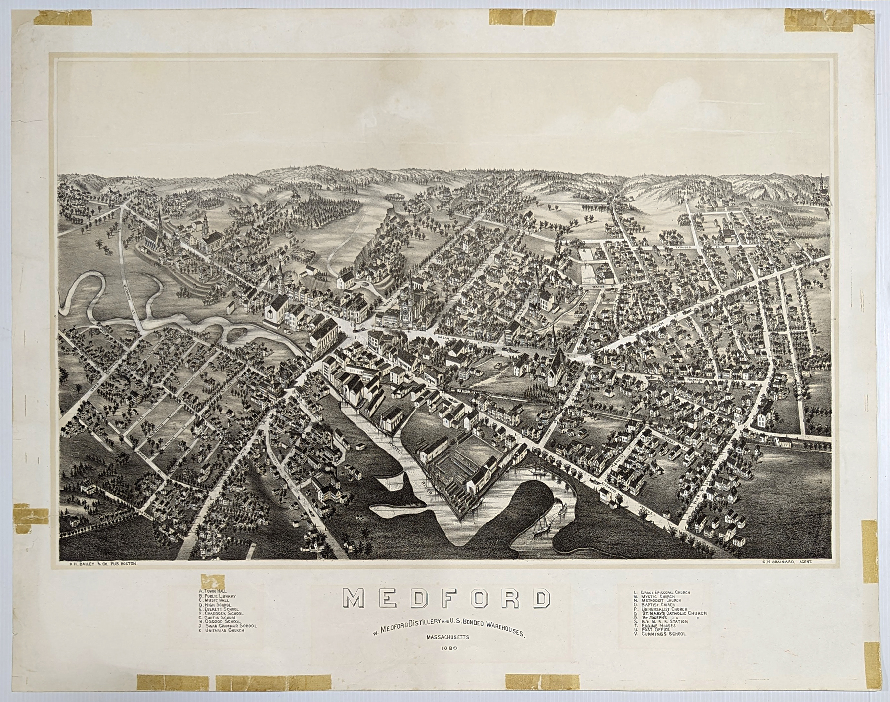 ![]() 242ma: Rare Medford Distillery, Lithograph 1880. Detailed Birdseye view of the historic town on the Mystic River and home to Medford Distillery. Original b/w. Condition - Interior 3/4" tape residue over first set of keys. Tape residue on outer edges but can easily be covered by matting. 22 x 27 7/8 in. $950 |
