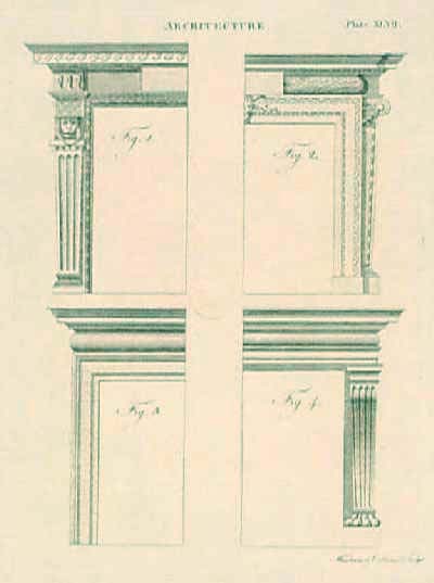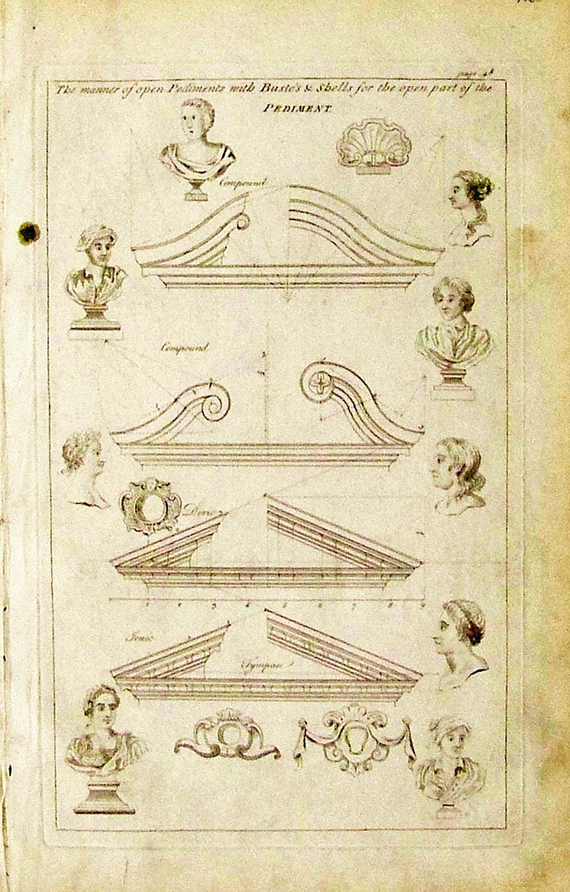 028arch: C.1890 Hand colored lithograph from Sketches in Germany & Switzerland showing The Rathaus-Wurzburg on the left and The Walls of Lucerne and the Wayside Chapel - Lucerne on the right. 16-1/2 x 11 -1/2 in. $40 ![]() 030arch: 1765 Copper engraving showing Open Pediments with Busto's & Shells for the Open Part of the Pediment. Small foxing outside of left border. 14 x 9 in. $80 |