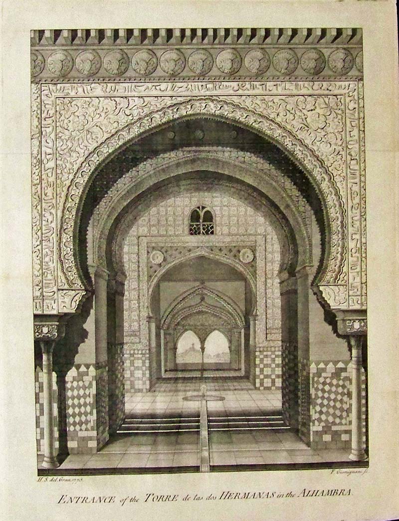 024arch: 1775 Exquisite copper engraving titled, "Entrance of the Torre de las dos Hermanas in the Alhambra." 14-1/2 x 11-1/2 in. $120