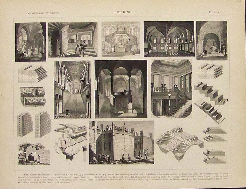 034arch: 1885 Wood engraving featured in Construction in Stone's Building page, Plate I. which shows Bonding and Masonry as well as an Ancient Grecian arch. 13-1/2 x 10-1/2 in. $40