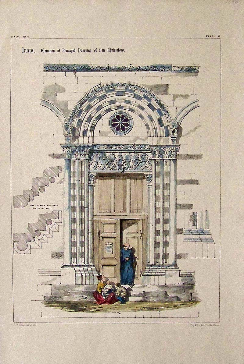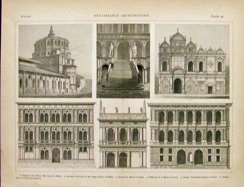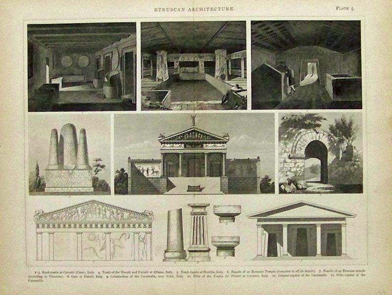 040arch: 1876 Wood engraving from Renaissance Architecture, Plate 42, for the Italian page which shows the Church of Sta. Maria delle Grazie at Milan; the Staircase in the court of the Doge's palace at Venice; the Scuola di S. Marco at Venice; the Biblioteca di S. Marco at Venice; and the Palazzo Vendramin-Calergi at Venice, including the Palazzo. 13 x 10-1/2 in. $40 ![]() 043arch: 1876 Half-tones from Etruscan Architecture, Plate 5 showing various Tombs and structures in Italy. 13-1/2 x 10-1/2 in. $40