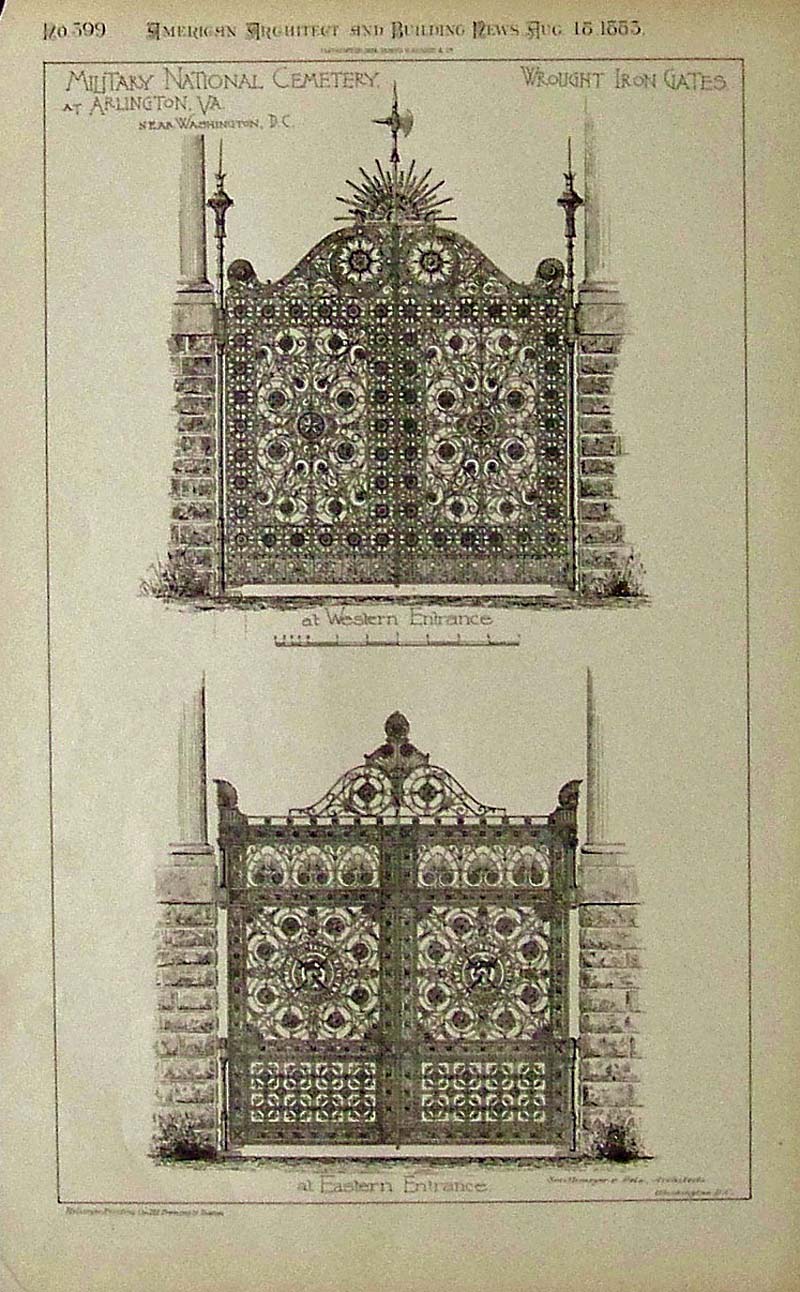 044arch: 1883 Wood engraving from the American Architect and Building News issue showing the Western Entrance and the Eastern Entrance at the Military National Cemetery at Arlington, VA. 13 x 8 in. $40