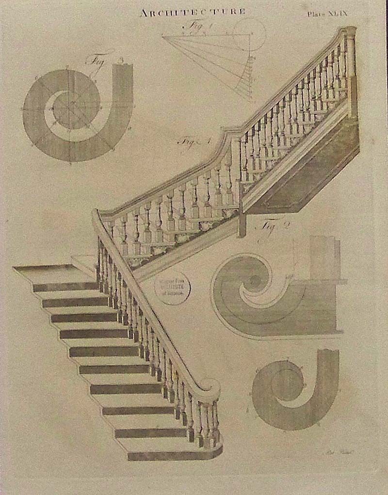 045arch: 1798 Copper engraving featured in Architecture, Plate XLIX showing a staircase and bannister with curled embellishment at bottom of staircase. 10-1/2 x 8 in. $60