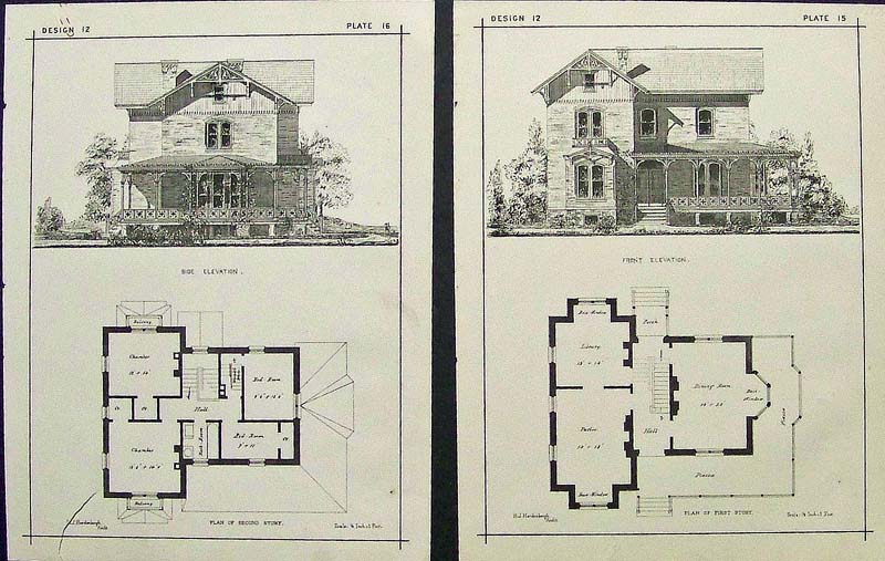 051arch: 1875 Lithographed set showing the Plans of the Side Elevation and the Front Elevation of one home, with one page showing the Second Story Plan and the other page showing Plan of First Story. The architect who designed the plans was H.J. Hardenbergh. These two images are sold as one set. Each image measures: 13-1/2 x 10 in. $80