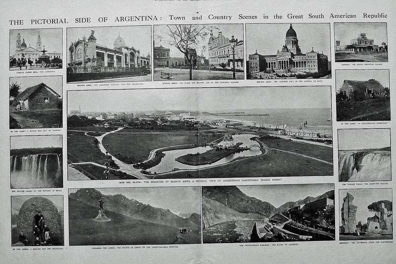 ![]() 016arg: 1910 The Graphic The Pictorial side of Argentina; Buenos Ayres, Mar Del Plata, Andes, Transandine Railway 22.75 x 16in. $40