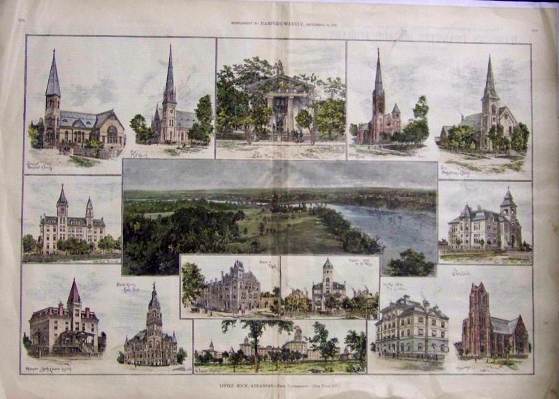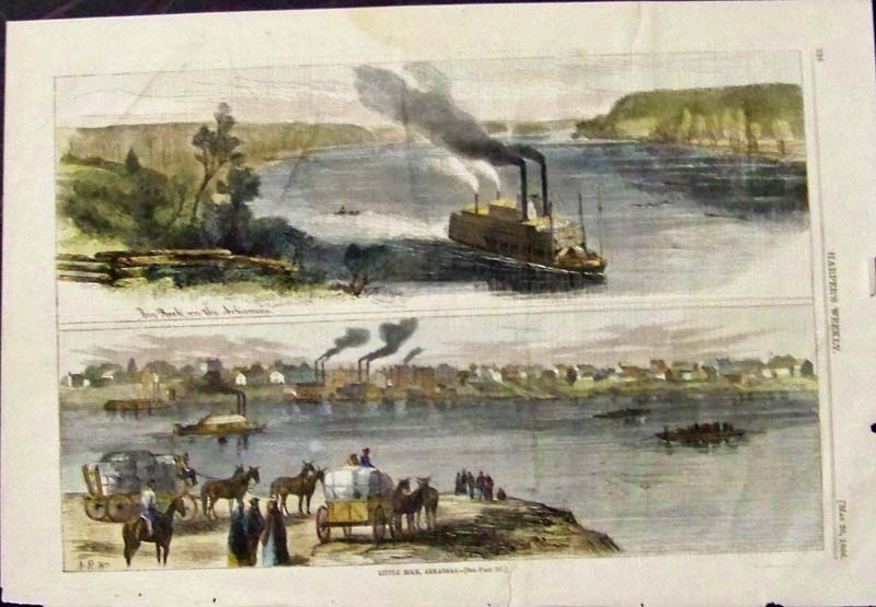 137Arkansas: 1855 J.H. Colton original hand colored engraved map of Arkansas. Colton was among the earliest map makers with very accurate maps of the United States. 17-1/2 x 14-1/2 in. $250 131ar: 1914 Hammond's Complete Map of Arkansas, Western Part, printed in color. Copyright by C.S. Hammond & Co., New York. 18 x 11 in. plus outside border. $50 132ar: 1878 Hand colored wood engraving featured in Harper's Weekly showing, "Forest Fire on the Banks of the Red River -- Drawn by W.A. Rogers." Scene shows a steamboat and raft with people gasping in horror at the spreading wildfire on the shore nearby. 16 x 11 in. $50 134ar: 1888 Hand colored wood engraving featured in Frank Leslie's Illustrated Newspaper titled, "Arkansas -- Views in Hot Springs, The Famous Health and Pleasure Resort." Engravings show the Opera House, the Railroad Depot, the City Post-Office, Central Avenue and Whittington Avenue. Also a nice bird's-eye view of the town of Hot Springs as observed from the Mountain Observatory. 16 x 11 in. $60 135ar: 1866 Hand colored wood engraving featured in Harper's Weekly titled, "Mustered Out" Colored Volunteers at Little Rock, Arkansas." The artist's initials, A.R.W. are shown on right bottom of image. Light discoloration just outside top center of border. 16 x 11 in. $80 ![]() 136ar: 1866 Hand colored wood engraving featured in Harper's Weekly showing Little Rock from the River in bottom engraving and top engraving shows a view of "Big Rock" on the Arkansas River. Title of images is, "Little Rock, Arkansas." 16 x 11 in. $75 |