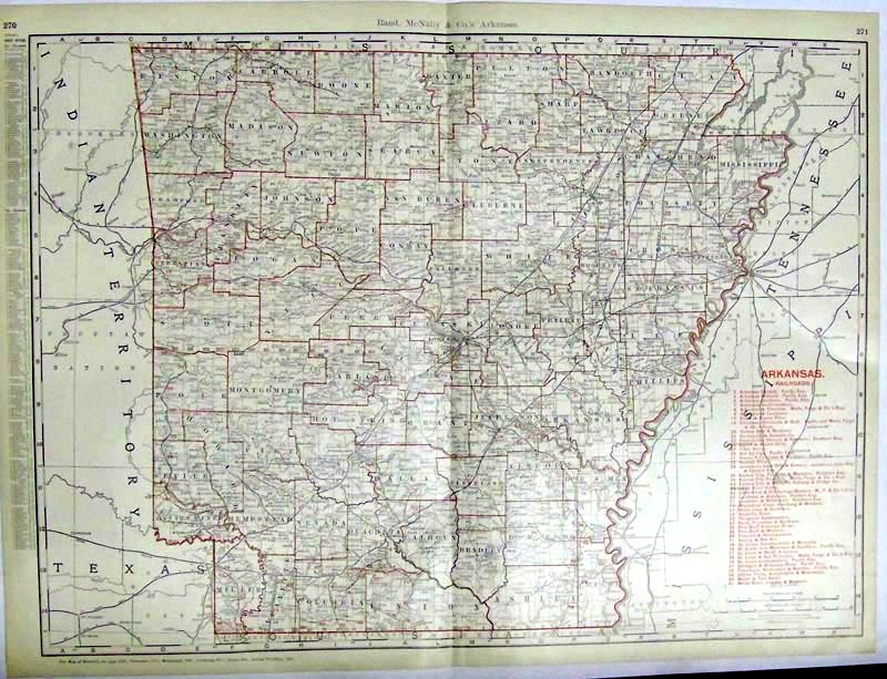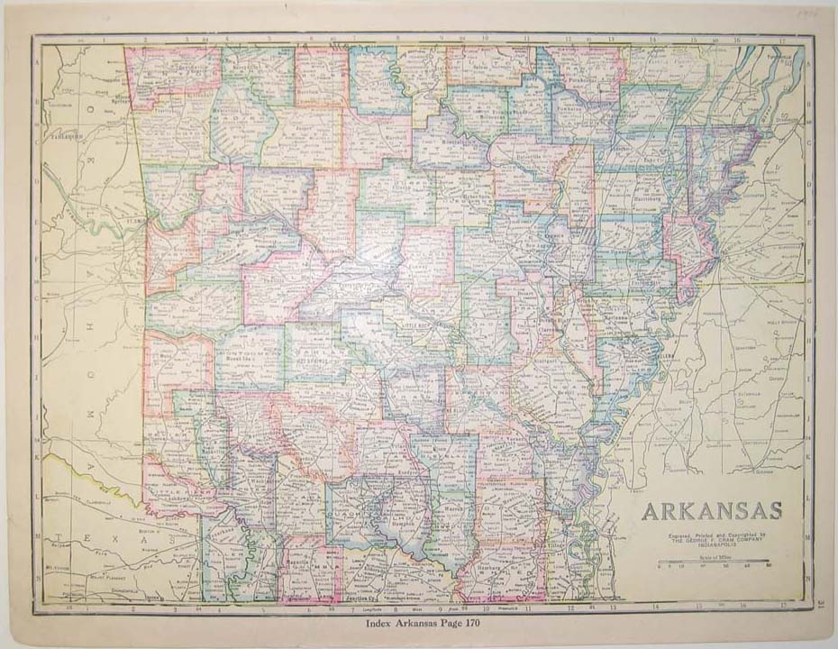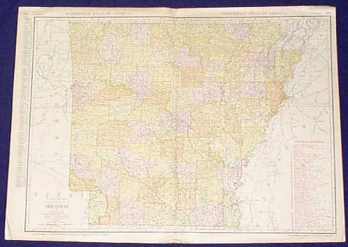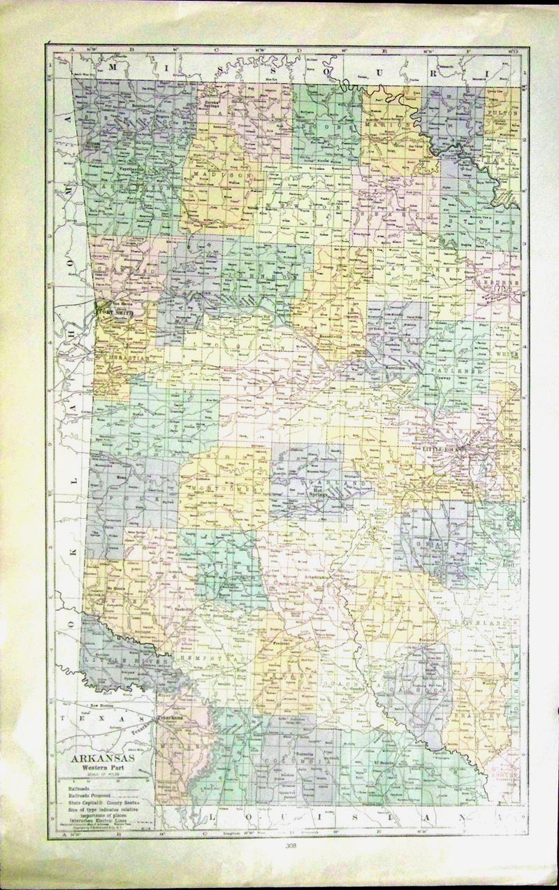 115ar: 1915 Arkansas map engraved, printed and copyrighted by The George F. Cram Company, Indianapolis 15x12in. $40 120ar: 1895, 1898 and 1900 Copyrighted, Rand, McNally & Co.'s Arkansas Railroads Map which includes key in bottom righthand side showing all the trains lines and names. 27-1/2 x 20-1/2 in. $90
