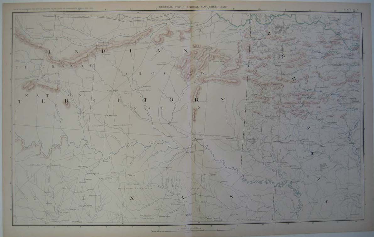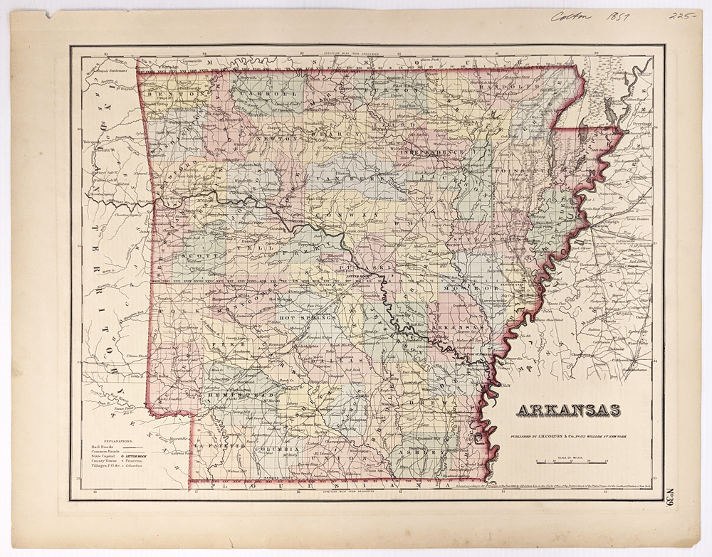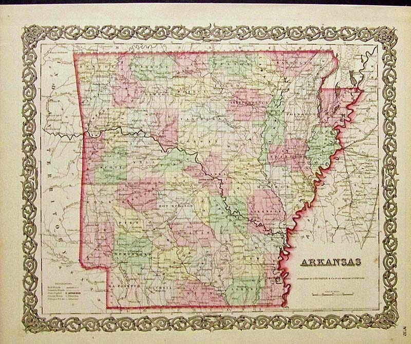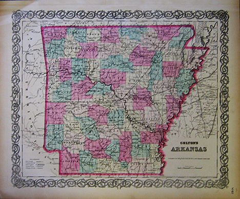 109ar: 1856 Colton's map of Arkansas. Railroads, towns, villages, rivers and mountians are all shown. There is a lovely engraved border surrounding the map. 14.5x17.5 in. $250 113ar: 1861-1865 Atlas to Accompany the Official Records of the Union and Confederate Armies, 1861-1865, which spans the areas of Arkansas, Tennessee and Mississippi - General Topographical Map Sheet XIX, Plate CLIV. 29x18in. $100