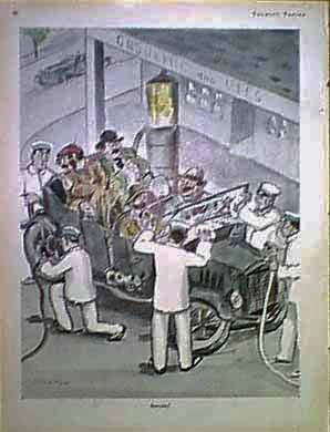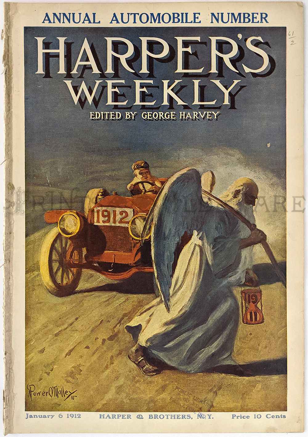 ![]() 015auto: 1895 New York Cycle Exhibition. National Bicycle Exhibition in Madison Square Garden. Original black & white engravings and second page of text from Scientific American. This is an important collector's item on the first national show. Two sheets. 11-1/2x16 $40 ![]() 020auto: Early Auto Racing, Ormond Beach Florida. Very nice chromolithograph from a 1906 issue of Judge. Caption reads, Father Time - "Take the glass, young man; you beat me." 13x18 in. $150 ![]() 021auto: Color lithographed cover of the German issue of Sport Im Bild by the artist, F. Neumann-Fred showing a racing car alongside a motocycle, surrounded by shrubery and hills. 13-1/2 x 9 in. $40 ![]() 022auto: Color lithographed cover of the German issue of Sport Im Bild showing a group of spectators watching two cars on a race track. 13-1/2 x 9 in. $40 ![]() 023auto: 1931 The American Road - Chromolithograph detailing that in 1931 there were 21,000,000 Passenger Cars. Image shows places of interest along the American roads. Featured is Coney Island, Indianapolis Speedway, Soldier Field, Chicago, and statistics of how many passenger cars were at each attraction. 22-1/2 x 14 in. $60 ![]() 024auto: 1911 Chromolithograph advertising, "In Ocean to Ocean Tour 12 Premier Cars Established World's Record." Advertisement for Premier Motor Mfg. Co., Indianapolis, Ind. 15-1/2 x 11 in. $40 ![]() 025auto: 1907 Half-tone advertising Autocar Spark Grip and Throttle Grip, Control Within Your Grip. Featured in Harper's Weekly. 13 x 9 in. $30 ![]() 026auto: 1918 Chromolithograph by Clyde Forsythe showing an older gentleman learning how to drive with the help of a younger man. Featured in Leslie's Weekly. 14 x 10 in. $30 ![]() 027auto: 1907 Half-tone featured in Leslie's Weekly titled, "Automobile Hill-Climbing Extraordinary." 16 x 11 in. $30