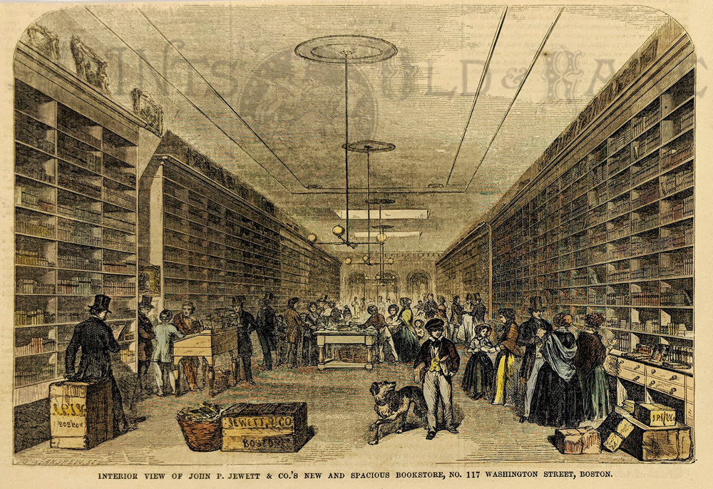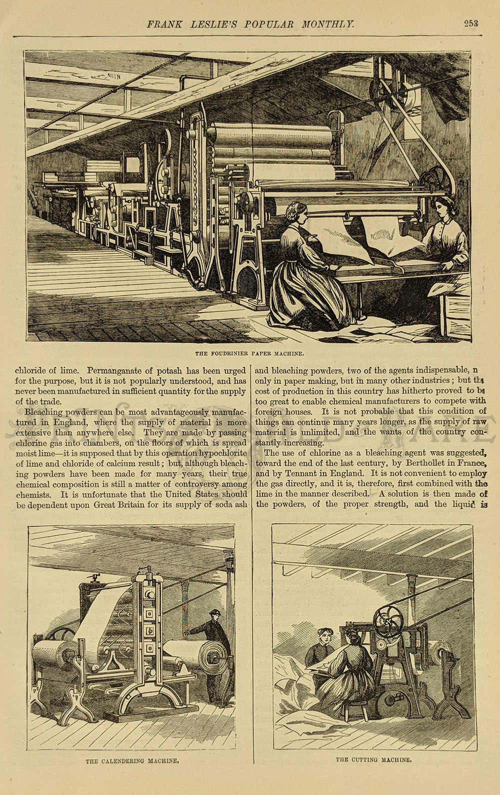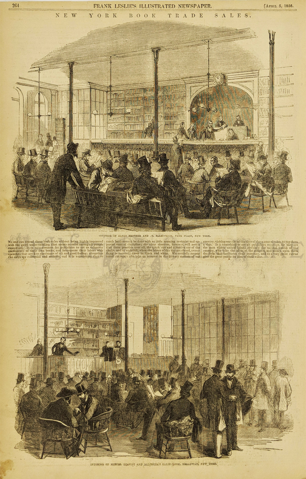 ![]() 009BookArts: Ad - c.1860 Cushings & Bailey, Booksellers & Stationers. Baltimore, MD. Nice engraved picture of inside the bookshop. Some faint off-setting. 16 1/8 x 13 1/8 in. $50 ![]() 010BookArts: Manufacture of Paper. 10pp article from Frank Leslie's Popular Monthly 1877. Illustrated w/ 10 wood engravings showing papyrus, and picking, sorting, boiling, cutting, washing and beating the rags, grinding, running prep, fourdrinier paper machine. 10 3/4 x 7 7/8 in. $45 ![]() 011BookArts: Book Publisher / House Waters 1855 New York City. Sheet “The Rush of Waters” New Year’s Gift for 1855. Cover is a hand colored engraving by G-Kerle. Depicting 2 floors of the establishment. 4 pages of music with words. Very rare. 10 3/8 x 13 5/8 in. $45 |