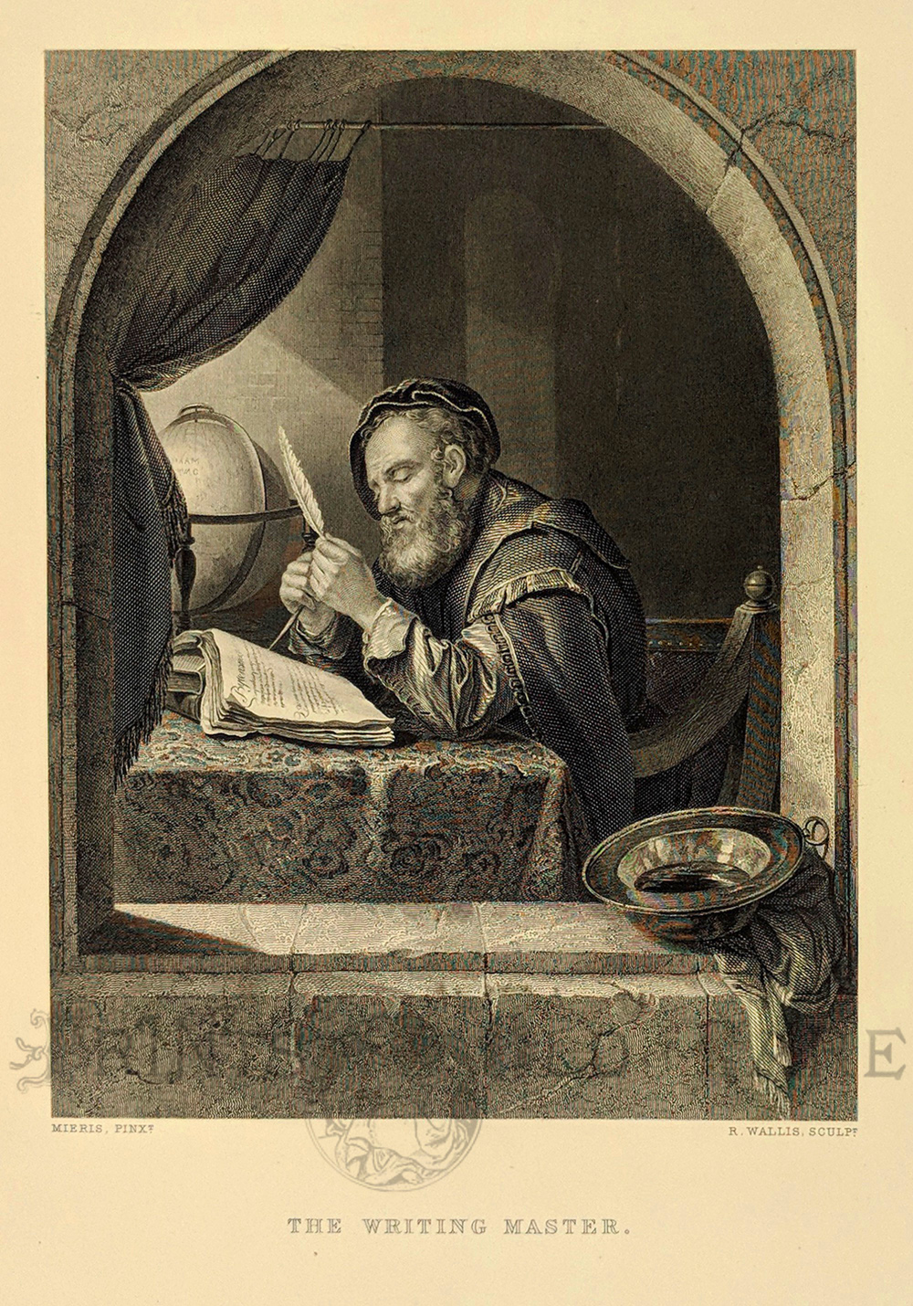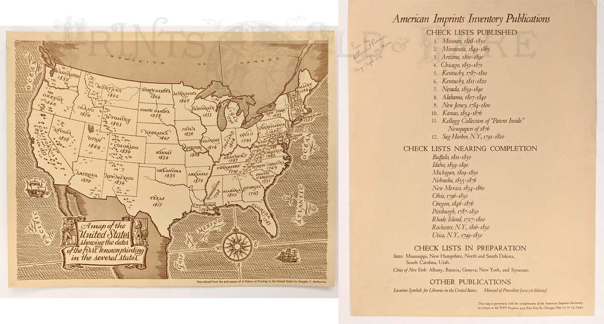 001BookArts: 2 ladies looking though a portfolio of prints. 1882 Hand colored wood engraving. 14 1/2 x 9 3/8 in. image size $50 ![]() 002BookArts: New York Book Trade Sales. 2 views of sales at Bongo Brothers, Park Place, and Leavitt and Delissier's on Broadway. 1865 Wood engraving. Rare. 15 x 9 1/2 in. image size $60 ![]() 003BookArts: "The Writing Master" Calligraphy. Steel engraving c. 1875 by W. Appleton & Co., New York. Medieval man sharpening his quill with manuscript open in front of him. 9 1/8 x 6 3/8 in. image size $35 ![]() 012pictorialmaps: Map of the US showing the dates of the first known printing in the several states 1940 by WPA by Douglas C. McMurtrie. Verso: American Imprints Inventory Publications. Pencil presentation: “Presented to Dr. Moon 1940.” 11 x 13 7/8 in. $150 |