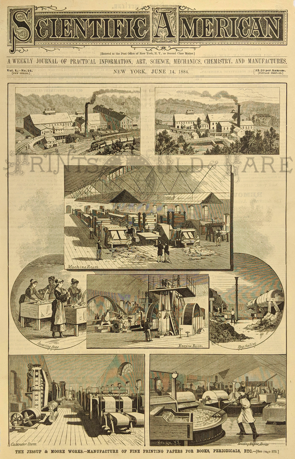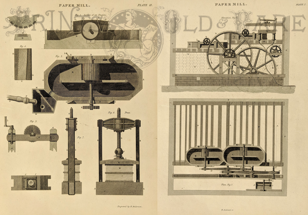 ![]() 004BookArts: Paper Manufacture. 1863, Copper engraving. England: Universal Map. "Method in the Paper Manufacture of Sizing the Sheets." 8 1/4 x 7 in. image size $60 ![]() 005BookArts: Retired Bookseller's Haven. Opening of bookseller's provident retreat for "affording a comfortable habitation for aged recipients." Wood engraving 1846 Illustrated London News. 14 3/8 x 9 3/8 in. image size $30 ![]() 006BookArts: Papermaking. 1884 - Manufacturing of Find Printing Paper for books, periodicals - Jessup & Moore Works, Philadelphia. Scientific American Cover. Wood engraving. 14 5/8 x 9 3/8 in. image size $45 ![]() 008BookArts: Paper Mill 1820. (2) Copper Engravings. Plate 1 & 2. Showing elevations and a press. 9 5/8 x 6 1/2 in. image size $50 pair |