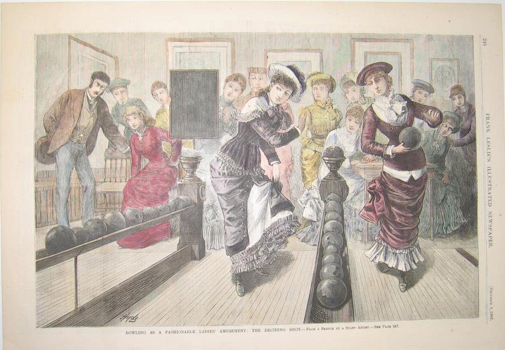 ![]() 002bow: 1872 Game of Bocce Ball. Bowling by Italian Franciscan friars in Rome. Uncolored antique woodcut print and text. 11x16 in. $40 ![]() 004bow: 1872 Lawn bowling print. English gentlemen enthusiastically playing "A Game at Bowls." Hand colored antique woodcut engraving. 10x16 in. $80 ![]() 100bow: 1869 Bowling Alley Scene. Nicely hand colored engraving from the August 28, 1869 issue of Harper's Weekly. Title is "A Ten-Strike." 11x16 in. $80 ![]() 101bow: Short, By Ginger! Hand colored half-tone showing contestants aiming for the post in a game of ring toss. 15 x 9-1/2 in. $40 ![]() 102bow: 1892 Bowling View. Scene of a young woman in Victorian dress, bowling with her friends. Hand colored antique engraving from the March 19, 1892 issue of Harper's Weekly. Title is, "At the Bowling Club Rolling for a Ten Strike." 11x16 in. $50 |