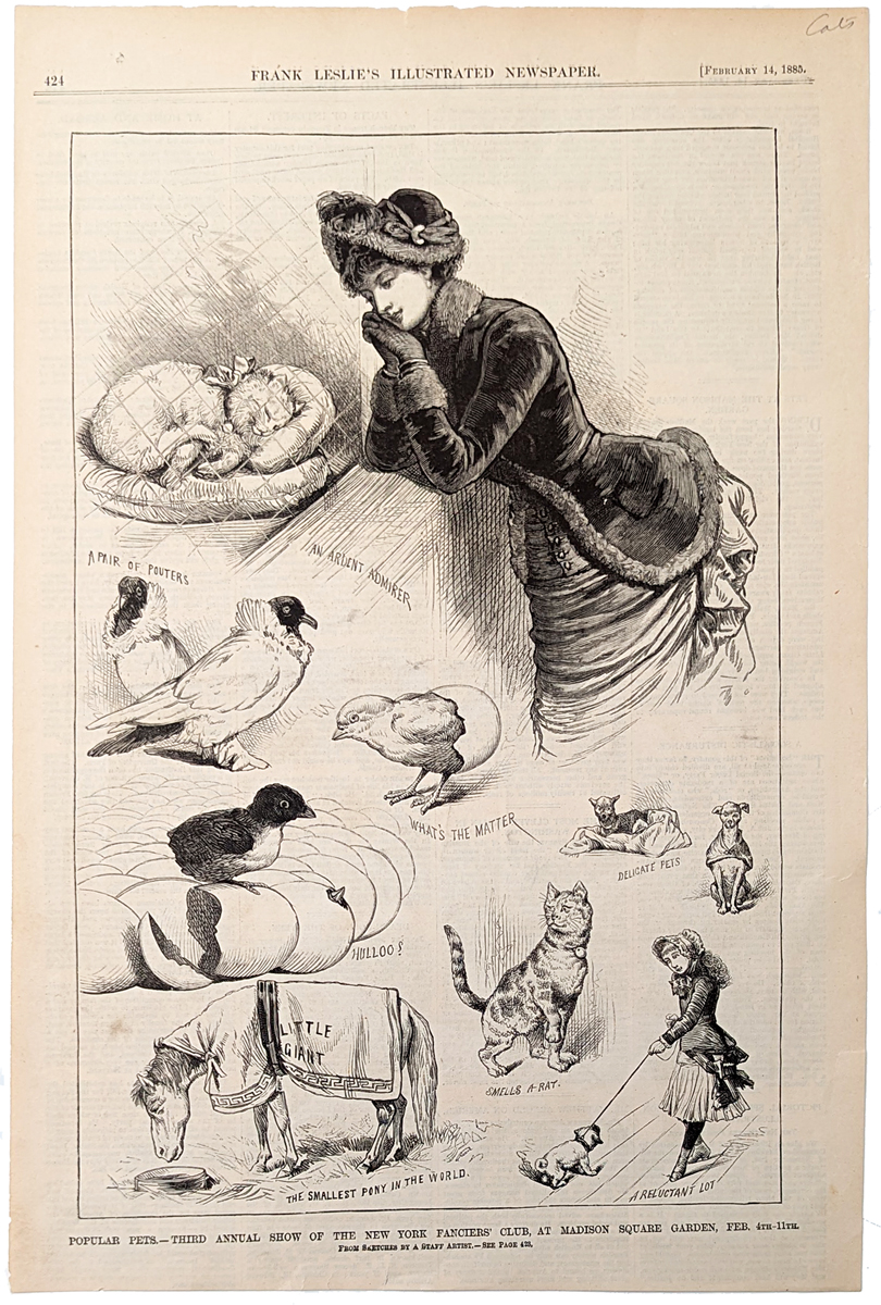 ![]() 001cats: 1831 Girl and Her Kitty. "Pussy and I." Touching picture of a little girl outdoors, embracing her cat as a butterfly flutters by. Hand colored antique engraving from Harper's. 11x16 in. $40 ![]() 002cats: C.1890s Chromolithograph showing The Cat. 12 x 10 in. $40 ![]() 003cats: 1890 Feline Fraternity. "My Noble Kinsman." Antique hand colored engraving of a cat gazing at a Tiger skin rug. Here is a nice piece with a fine example of a Louis Wain cat. Wain who was no stranger to illustrated newspaper got an early start with the illustrated London news in the early 1880s. Wain would become a prolific artist featured in many periodicals and children’s books, after death he’s been the subject of many movies and publishing books. 8 x 9 1/2 in. $40 ![]() 004cats: 1867 Kitty Comes Home. "The Wanderer Returned." Hand colored original engraving of a cat returning home, waiting at the door in the snow. Harper's. 11x8 in. $40 SOLD ![]() 006cats: 1896 Chromolithograph titled, "Anxious Moments," which shows hungry kitties watching another cat gnaw on a bone. 26 x 21 in. $300 ![]() 012cats: 1875 Cats Waiting for Supper. "Patience." Nicely hand colored antique engraved view of two cats and a dog waiting by their meal dish. Text included. From the Aldine. 11x16 in. $30 ![]() 014cats: 1869 Wildcat Family. "The Wildcat and her Litter." Black & white original antique engraving shows a wild cat scuffling with her little ones. 10-1/4x8 in. $20 ![]() 015cats: 1885 Popular Pets. Black & white engravings of favorite animals, from the 3rd Annual Show of the New York Fanciers' Club, Madison Square Garden. Leslie's. 11x16 in. $40 |