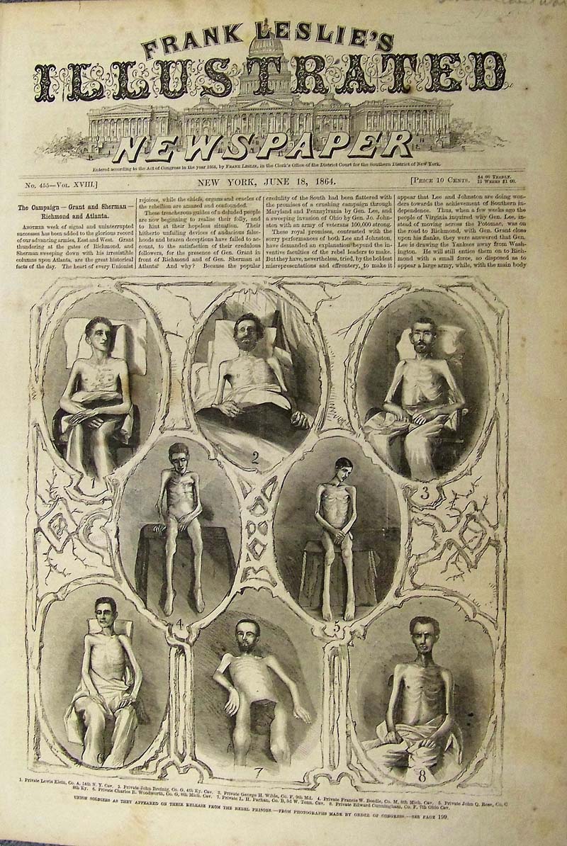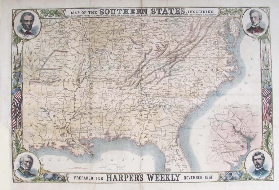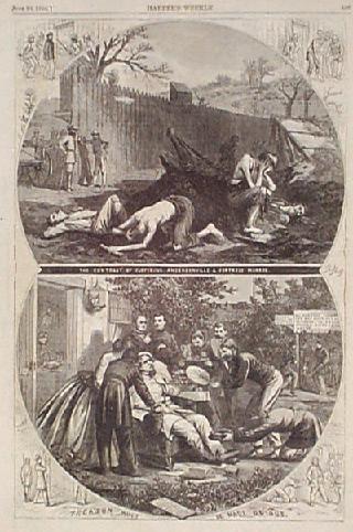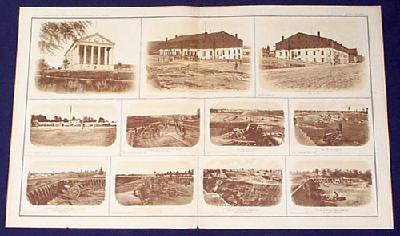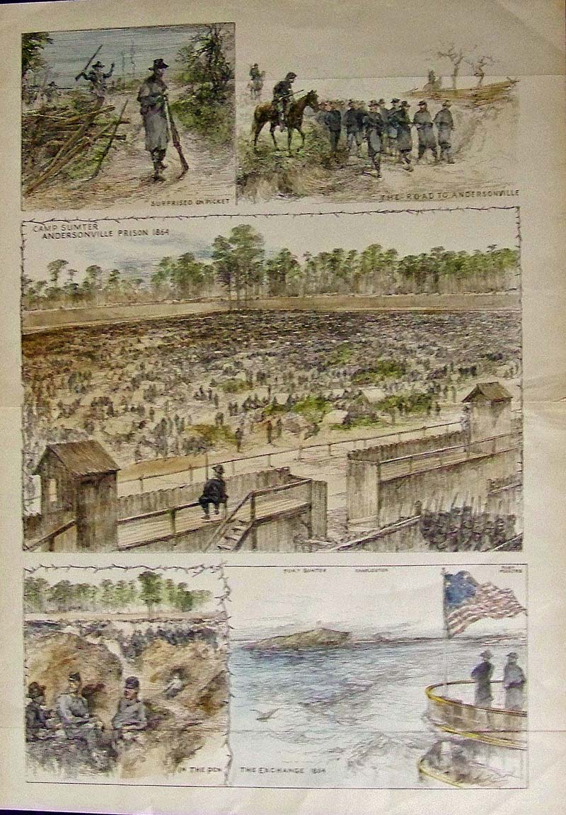 ![]() 000cw: Map of the Southern States, 1861 Harper's Weekly - A large and incredibly handsome map showing good detail of the towns, villages, railroads, and the ship blockade of the south. The title continues along the bottom: "Prepared for Harper's Weekly November 1861." Map is surrounded by a spectacular decorative border and it features portraits at each corner of Lincoln, Seward, General Scott, and General McClellan. An inset of Washington, D.C. lies at the lower right. This was an uncommon issue published on November 9, 1861. Condition: Good, mended lower left border. Otherwise good margins and great colors with normal aging throughout. Three vertical folds. 33 x 22 in. $400 ![]() 001cw: Civil War Atlanta and Richmond. Large page of sepia tone views of both areas, from the official records of the Union and Confederate Armies. Authentic antique c1880. 28x18-1/2 in. $80 ![]() 002cw: ANDERSONVILLE CIVIL WAR PRISON - CAMP SUMTER. C.1890 Series of engravings showing views of Andersonville (Georgia) Prison, or Camp Sumter, which, during its 14 months, held over 45,000 Union prisoners - almost 13,000 of these died from disease, poor sanitation, malnutrition, overcrowding, or exposure to the elements. A genuine Civil War era antique print. 23 x 17 in. Color: $150 B/W: $120