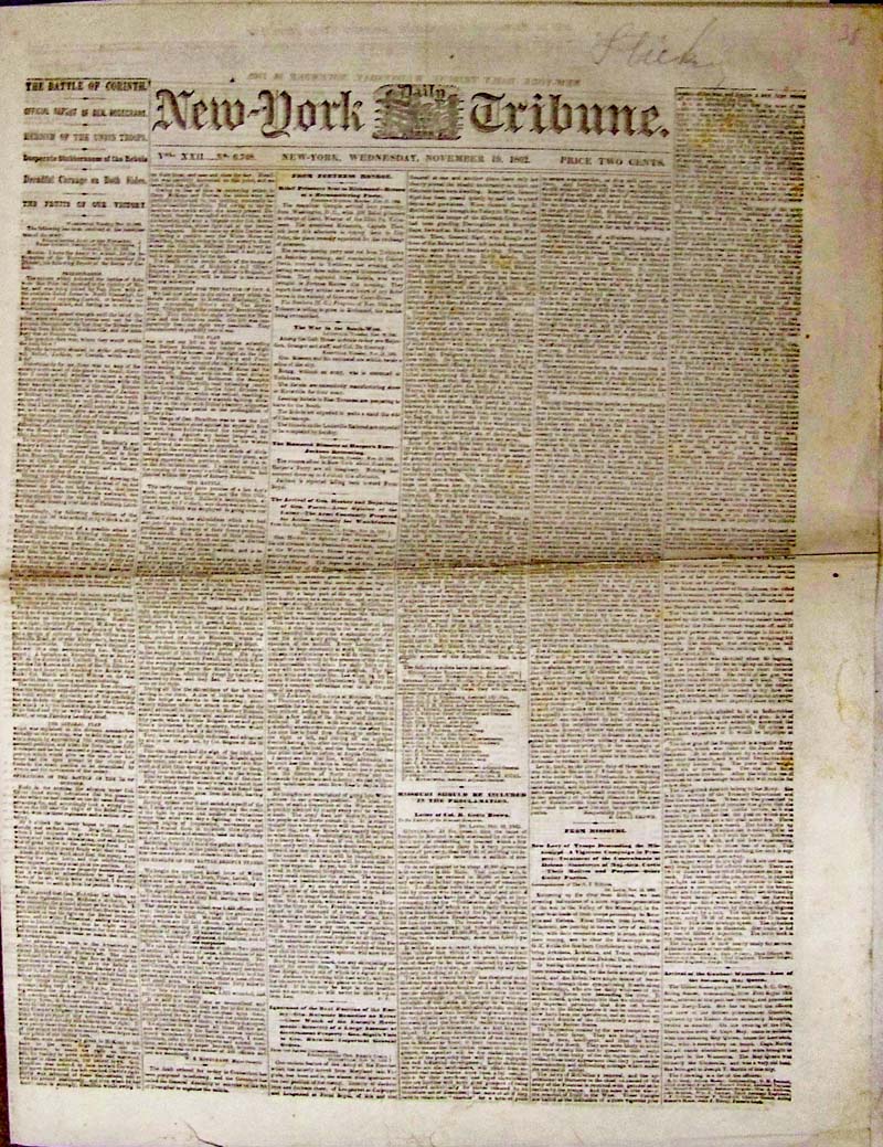 003cw: 1862 Civil War in Tribune - Battle of Corinth, Tennessee. This New-York Daily Tribune, dated November 19, 1862 features two long columns describing the battle, including description of "Desperate, stubborness of the Rebels." Eight pages total. Also inside newspaper are notes from Missouri, Refugees from Texas, and War in the Southwest. Fine condition, printed in black and white. 19 x 14-1/2 in. $35