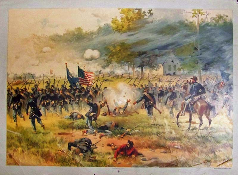 008cw: 1887 color lithograph showing the Antietam battlefield, published by the American Lithograph Co., copyrighted by L. Prang & Company, Boston. 23-1/2 x 17 in. $150