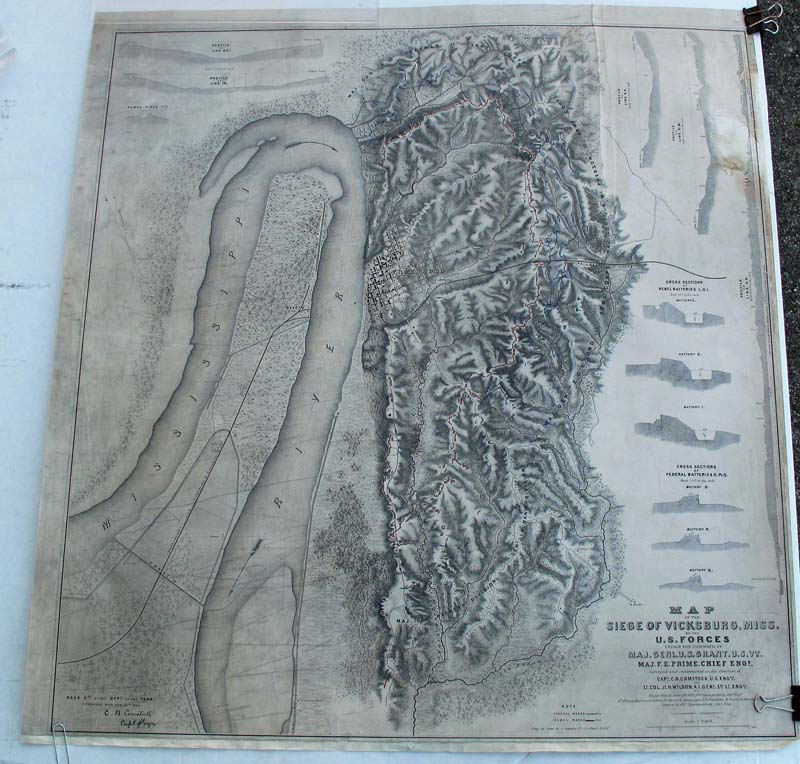 010cw: Map of the Siege of Vicksburg, Mississippi by the U.S. Forces Under the Command of Maj. General U.S. Grant, U.S. VLS. This map is an attractive, highly detailed black and white lithographed map showing the topography around Vicksburg, with five profiles, six cross-sections of batteries and one cross-section of a "rebel rifle pit." There is a 4-inch square patch in the upper right margin. 29 x 27-1/2 in. $395
