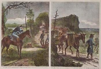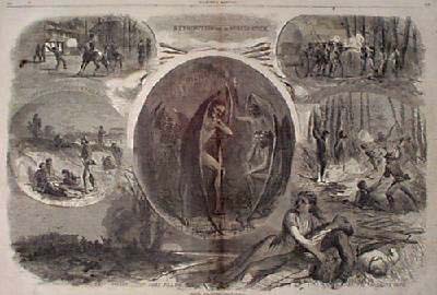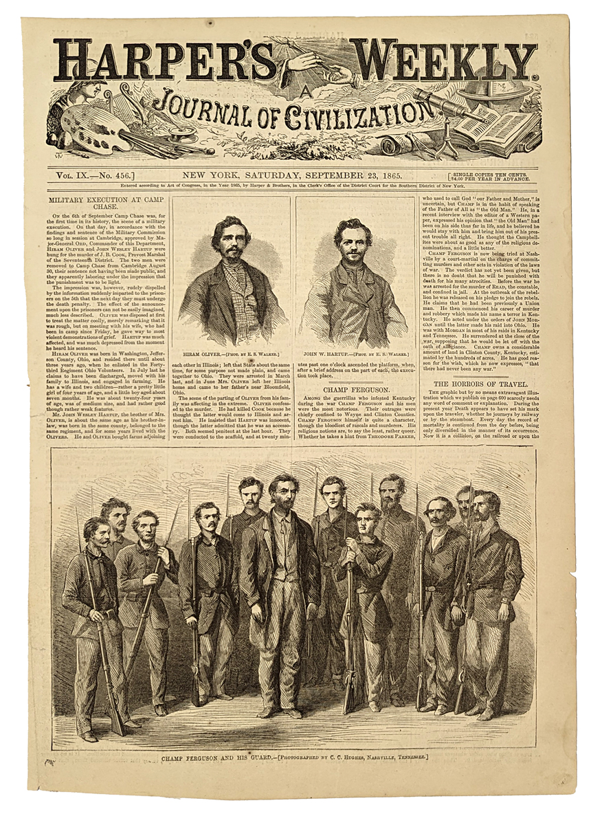 ![]() 149Kentucky: Champ Ferguson and his Guard 1865. A brief history during his trial in Nashville where he was accused of raids in Kentucky and Ohio and other crimes. Wood engraving. 10 3/8 x 15 1/2 in. $60 |