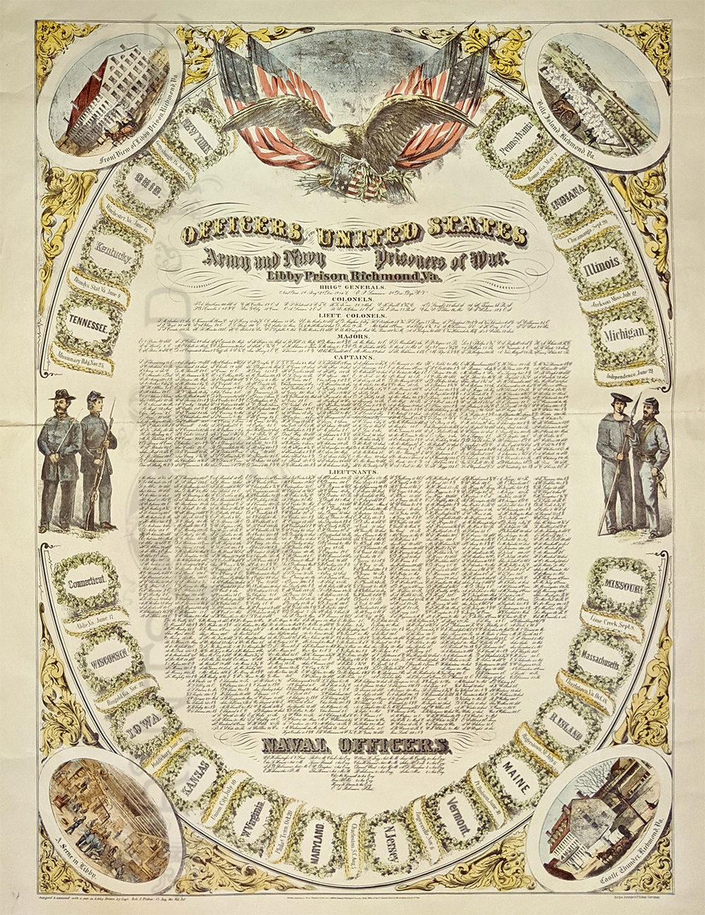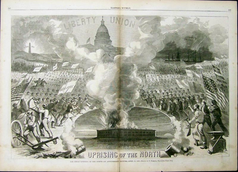 ![]() 223cw: Officers of the United States Army and Navy Prisoners of War. Libby Prison, Richmond, Va. Huge lithograph which lists Army officers listed first by rank, followed by short list of Naval officers. Penned by Captain Robert J. Fisher of the 17th Missouri Volunteers during his imprisonment. The list is surmounted by a patriotic eagle and is surrounded by the name of each state in the Union. Print features vignettes in each corner depicting scenes of Libby Prison, Belle Island, and Castle Thunder, in Richmond, VA. *Archivally mended and patched. 27 x 41 in. $300 ![]() 352xmas: Thomas Nast’s “Christmas 1863” Great Scenes: Civil War Soilder, Home on Furlough, Santa visiting the children. 1863 Harper’s Weekly. Wood engraving. 16 x 22 in. Check for Availibilty ![]() 239Charleston: Confederate Batteries Bombing Ft. Sumpter. Dramatic Military scene - Start of Civil War. 1861. Water colored, Wood engraving. 14 1/2 x 20 in. Image $250 ![]() 239linc: Thomas Nast Engraving of a Civil War Thanksgiving "United We Stand." Showing Abraham Lincoln and The Generals standing on the Rebel Flag, congratulating a victorious Union Soldier. Middle image is surrounded by various patriotic and war scenes. 1864. Published by Harper's Weekly. Wood engraving. 15 1/4 x 22 in. $300