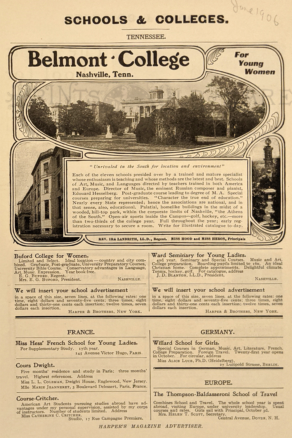 ![]() 204na: Belmont College ad 1906. This Nashville Institution was at that time “for young women” unrivaled in the south for location and environment. 6 ¼ x 9 ½ in. $25