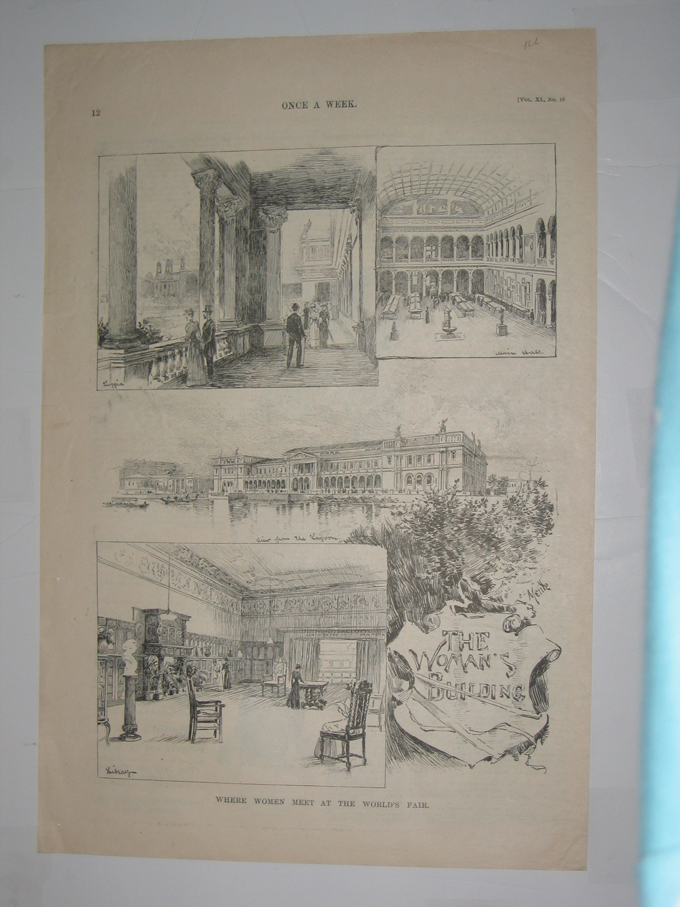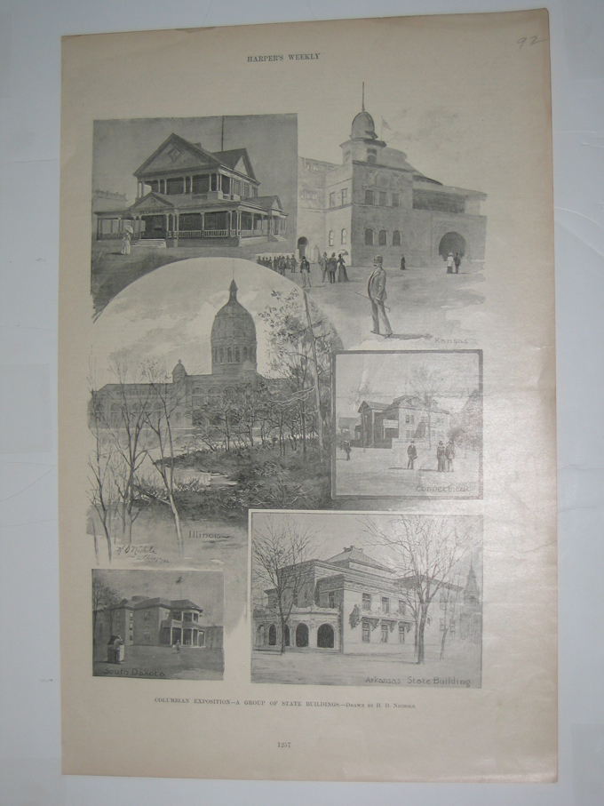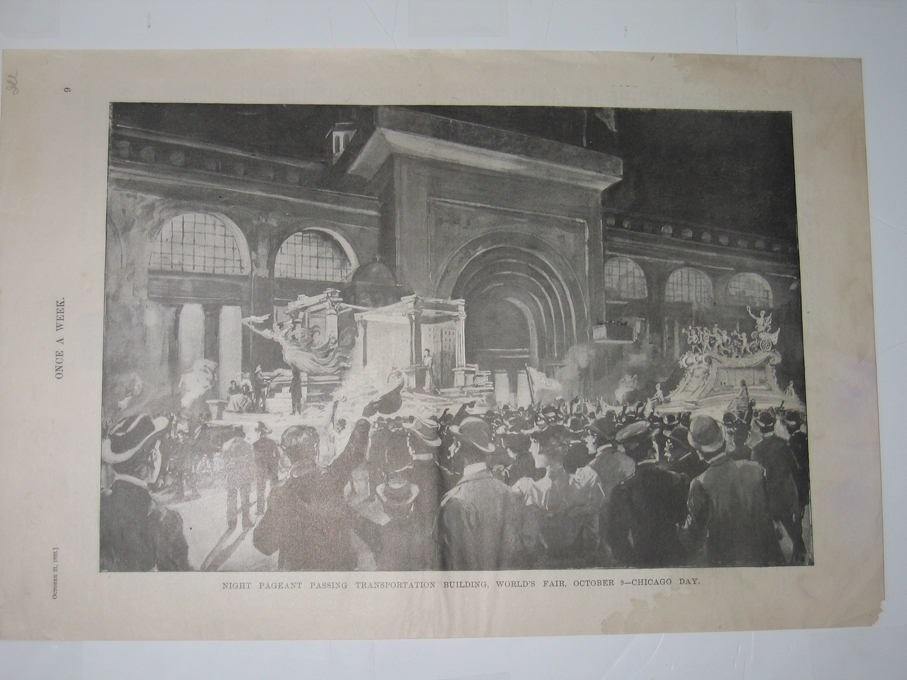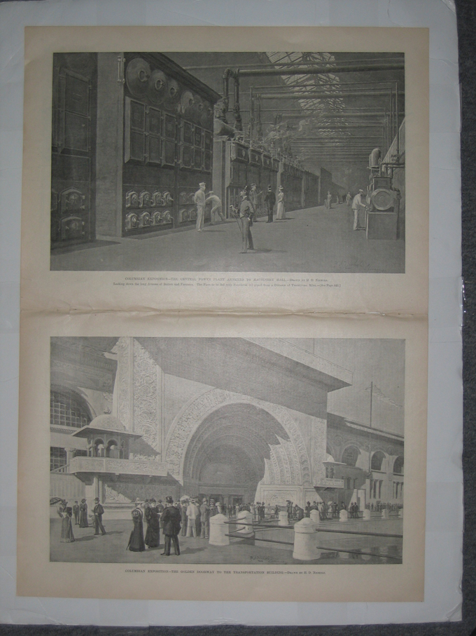 ![]() 002coex: 1893 Night Pageant Passing Transportation Building, World's Fair, October 9 - Chicago Day. Half-tone published in Once A Week on October 21, 1893 depicts a large gathering of people standing in front of the Transportation Building at the World's Fair. 11x16in. $30 ![]() 003coex: 1892 Columbian Exposition - A Group Of State Buildings - Drawn By H.D. Nichols. Six old half-tone pictures on one page published in Harper's Weekly in 1892 depicting six State buildings at the Columbian Exposition. 11x16in. $30 ![]() 004coex: 1893 President Cleveland Opening The Fair. Half-tone picture published in Once A Week, An Illustrated Weekly Newspaper, on May 13, 1893 which depicts President Cleveland standing in front of an audience from his flag-draped podium as he opens the fair. 11x16in. $30 ![]() 006coex: 1891 The Columbian Exposition - Drawings Made From The Accepted Plans By Charles Graham. Two wood engravings published in Harper's Weekly on May 2, 1891. Volume XXXV., No. 1793. Caption for top picture reads: The Electrical Building; Bottom caption reads: The Mining Building. 11x16in. $30 ![]() 007coex: 1893 Where Women Meet At The World's Fair. Four wood engravings on one page published in Once A Week on August 12, 1893. Vol. XL., No. 18. From top to bottom, each picture reads: Loggia, Main Hall, View From The Lagoon, The Woman's Building AND Library. 11x16in. $30 ![]() 008coex: 1891 The Machinery Hall, Model Of The Battle Ship Illinois AND View Of Lagoon. Three wood engravings on one page with text, published in Scientific American on June 27, 1891. 11x16in. $30 ![]() 011coex: 1893 The World's Columbian Exposition - Engineering Work And The Industrial Arts. Three hand colored wood engravings with text published in Scientific American, A Weekly Journal of Practical Art, Science, Mechanics, Chemistry, and Manufactures on August 12, 1893. Vol. LXIX., No. 7. Top engraving reads: Group of American Chemical and Pharmaceutical Products; Left engraving reads: A German Exhibit of Welded and Bent Tubes; and bottom engraving reads: The Babcock & Wilcox Boilers. 11x16in. $40 |