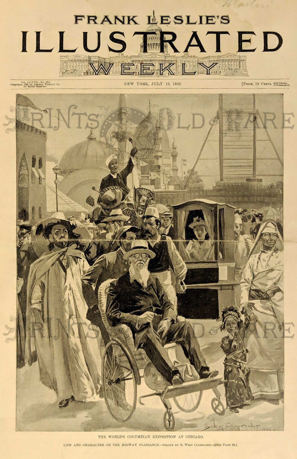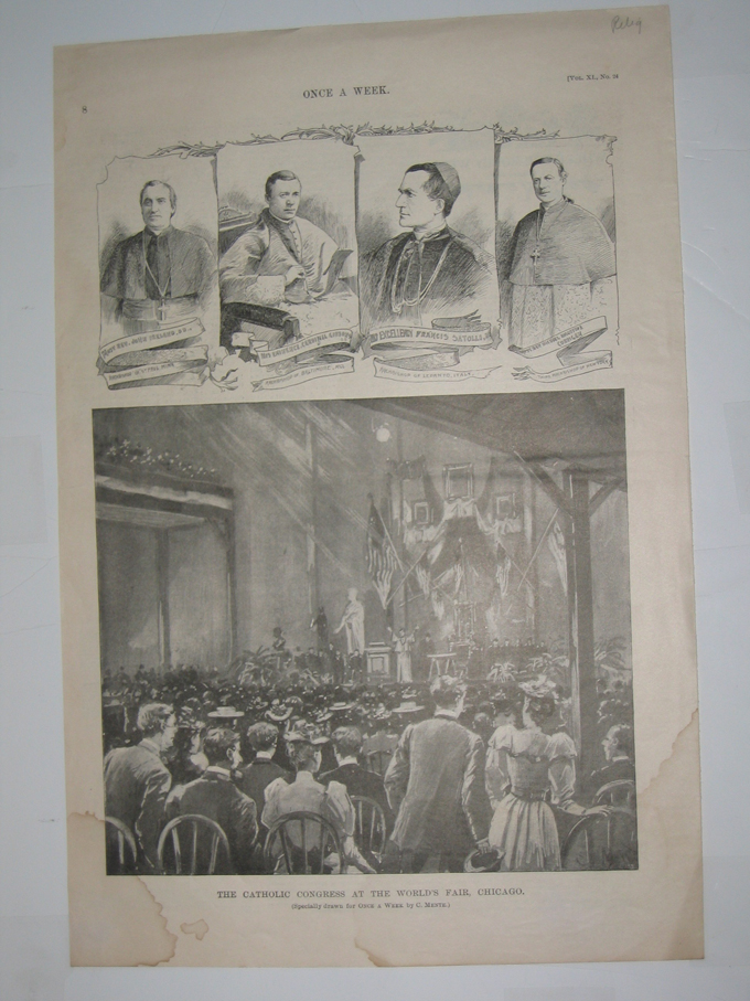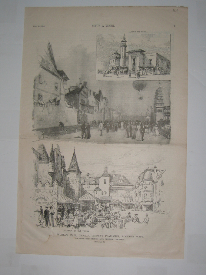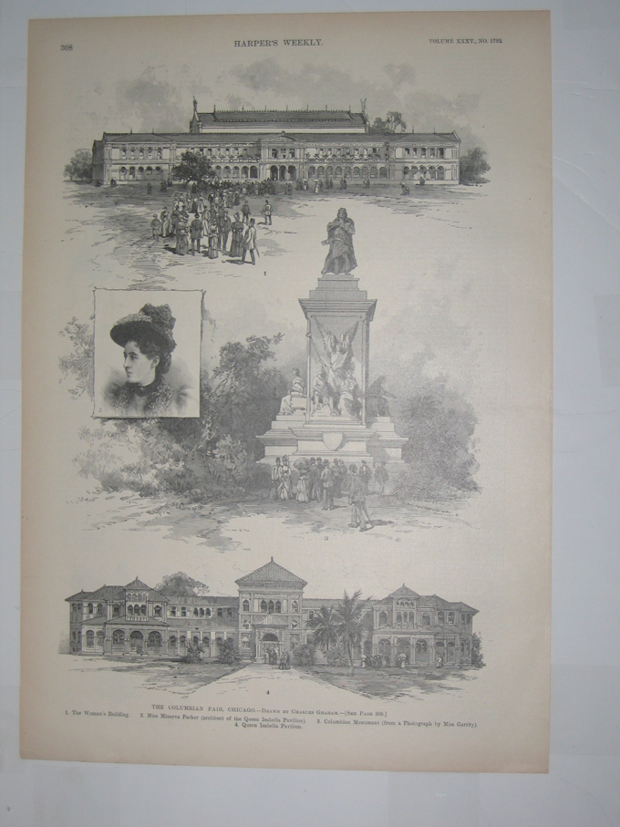 ![]() 012coex: 1893 World's Fair, Chicago - Midway Plaisance, Looking West. One half-tone and two wood engravings published in Once A Week on July 29, 1893 which depict the old Vienna and Chinese Theater, along with a picture of Algeria and Persia on top inset. 11x16in. $30 ![]() 013coex: 1893 The Catholic Congress At The World's Fair, Chicago (Specially drawn for Once A Week by C. Mente). Four small wood engravings on top of page of priests and in bottom of page is a half-tone depicting the Catholic Congress at the World's Fair in Chicago. Published in Once A Week on September 23, 1893. Vol. XI., No. 24. 11x16in. $30 ![]() 014coex: 1891 The Columbian Fair, Chicago - Drawn By Charles Graham. Four wood engravings published in Harper's Weekly on April 25, 1891. Volume XXXV., No. 1792. From top to bottom: 1. The Woman's Building; 2. Miss Minerva Parker (architect of the Queen Isabella Pavillion); 3. Columbian Monument (from a Photograph by Miss Garrity); 4. Queen Isabella Pavillion. 11x16in. $30 ![]() 015coex: 1892 Columbian Exposition, Chicago - A Visit to the Roof of the Woman's Building. Three wood engravings published in Harper's Weekly on January 9, 1892. Volume XXXVI., No. 1829. Top engravings depict The Duke of Connaught and Prince Christian of Schleswig-Holstein, who was accidentally shot by The Duke of Connaught. Bottom engraving depicts the construction of the Woman's Building on the roof. 11x16in. $30 ![]() 017coex: c1800s Columbian Exposition - The Fourth-Of-July Crowds Going To The Fair Grounds - Drawn By Victor Perard. Half-tone and wood engravings published in Harper's Weekly depicts the Greatest Day of the Fair thus far with 274,917 in Attendance. 11x16in. $30 ![]() 018coex: 1893 The Columbian Exposition At Chicago, From Photographs By Hemment, Taken Expressly for Frank Leslie's Weekly. Four half-tone pictures depicting the monument in front of Ohio State building; Sterilized drinking water; Pay-day at the Auditor's Office; and Rolling-Chairs pushed by college students which represent over one hundred colleges in all parts of the country.11x16in. $30 ![]() 019coex: 1892 The Columbian Exposition - Quitting-Hour At Jackson Park - Drawn by Graham and Walker. Half-tone picture published in Harper's Weekly on May 21, 1892. Picture depicts lots of men leaving their posts after a hard day's work at the Columbian Exposition. 11x16in. $30 ![]() 020coex: 1892 The Columbian Exposition - The Building From Wooded Island - Drawn by Charles Graham. Wood engraving published in Harper's Weekly, A Journal of Civilization on April 30, 1892. Engraving depicts a gardener planting a sapling just across the stream from the Columbian Exposition. 11x16in. $30 |