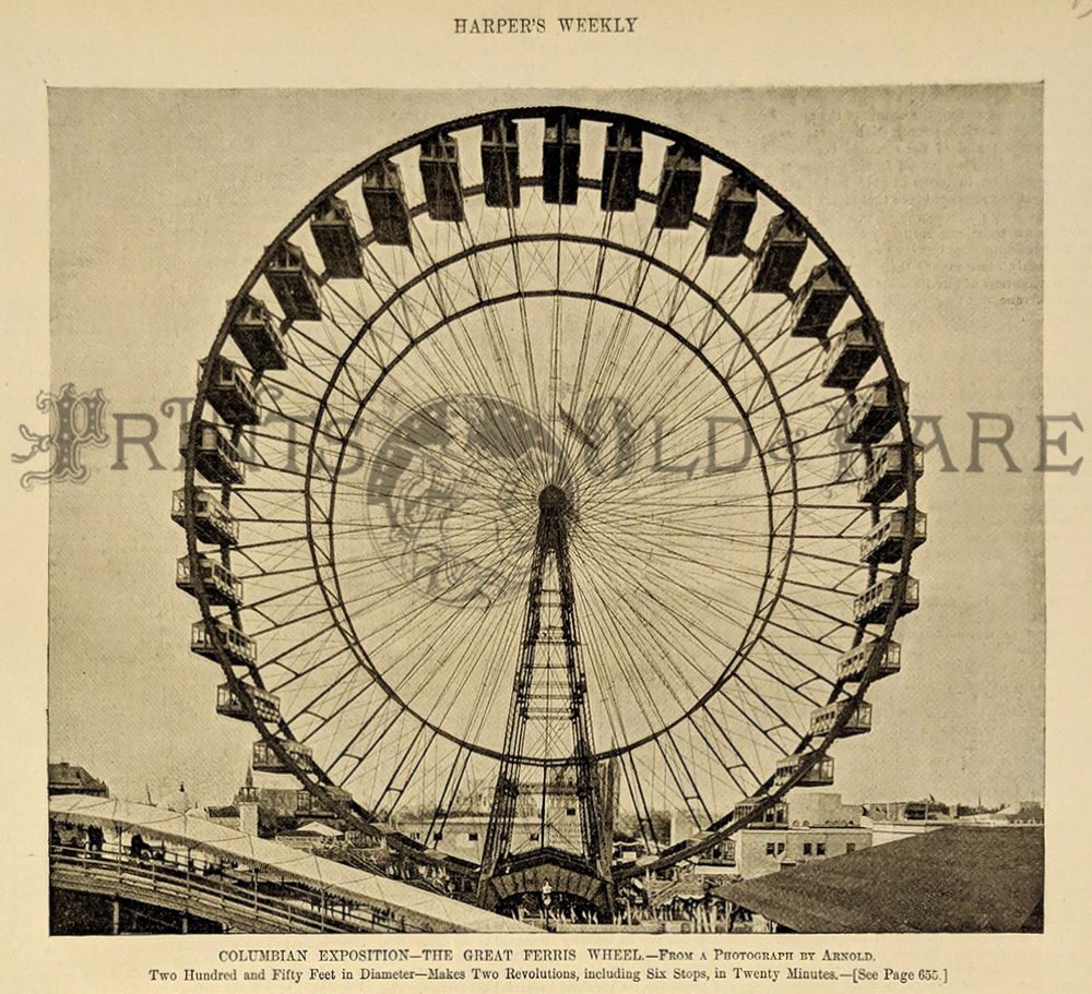 ![]() 024coex: "The World's Columbian Exposition at Chicago." - Life and Character on the Midway Plaisance. Published in Frank Leslie's Illustrated Weekly. 1893. 11x16 in. $80 ![]() 025coex: "Columbian Exposition - The Great Ferris Wheel." - Two hundred and Fifty Feet in Diameter - Makes Two Revolutions, including Six stops, in Twenty Minutes. 1893 Harper's Weekly. 8 x 10 in. $80 ![]() 027coex: Columbian Exposition - An Evening at Old Vienna. Fair goers having a nice dinner with the Ferris wheel in the background. Drawn by T. de Thulstrup. 1893 Harper's Weekly. 11 x 16 in. $80 ![]() 028coex: Columbian Exposition - Large print showing a bird's-eye view of the buildings and grounds as they will appear in 1893. Drawn by Charles Graham. 1891 Harper's Weekly Supplement. Hand colored, wood engraving. 15 3/4 x 45 1/4 in. $400 ![]() 029coex: Columbian Exposition, Chicago - The Statue of "The Republic" in the east end of the Grand Basin. 1892 Harper's Weekly. Hand colored, wood engraving. 11 3/8 x 15 5/8 in. $80 ![]() 030coex: Columbian Exposition, Chicago - The present state of the grounds and buildings. 1891 Harper's Weekly. Hand colored, wood engraving. 11 x 15 7/8 in. $80 ![]() 021coex: 1892 Columbian Exposition, Chicago - Placing Exterior Decorations On The Horticultural Building - Drawn by Charles Graham. Half-tone picture depicts crew members placing decorations around the Horticultural building's large dome as people stroll along on the ground in front. Picture published in Harper's Weekly on March 12, 1892. 11x16in. $30 ![]() 022coex: 1893 Columbian Exposition - The Central Power Plant Annexed To Machinery Hall - Drawn by H.D. Nichols AND Columbian Exposition - The Golden Doorway To The Transportation Building - Drawn by H.D. Nichols. Two half-tone pictures published in Harper's Weekly in 1893. The Transportation Building was designed by Louis Henri Sullivan, famous American architect who taught Frank Lloyd Wright. 16x22in. $40 ![]() 023coex: 1881 World's Fair Fancies. Hand colored wood engravings published in PUCK in 1881 depict several cartoons relating to the World's Fair. 10x13.5in. $30 |