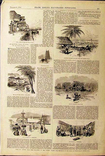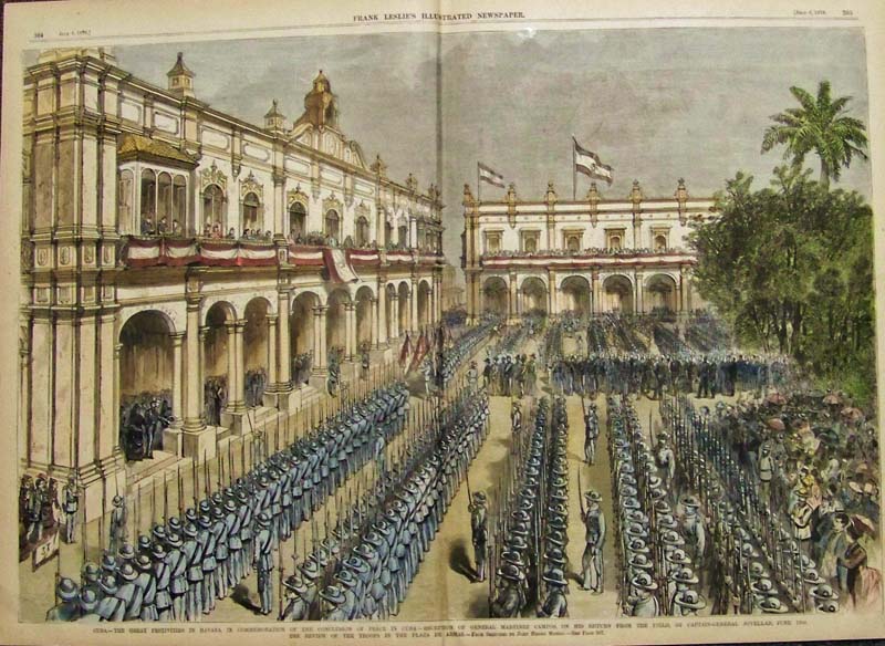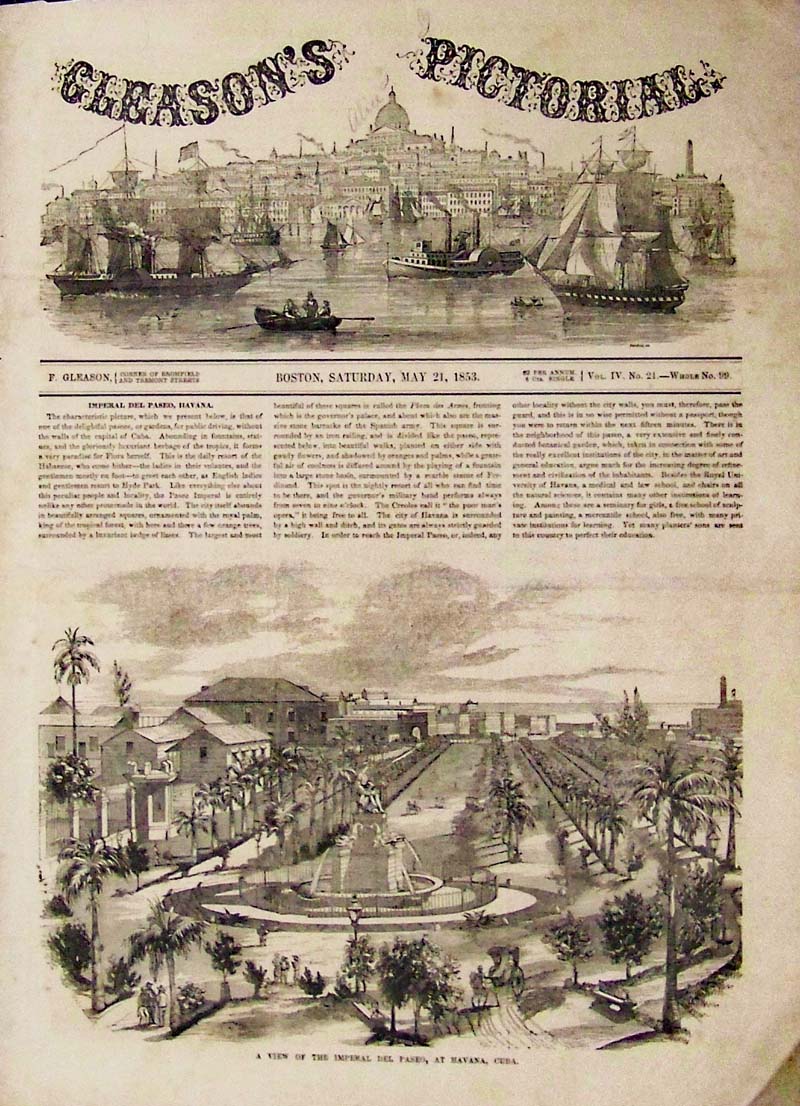 ![]() 003cuba: 1853 Havana view. Great overview of Imperial Del Paseo, Havana. Antique hand colored front page view from Gleason's. 10-1/2x15 in. $50 ![]() 005cuba: 1853 Alameda De Paula, Havana. Rare black and white engraving, with text. Original antique front page, Illustrated News, London, 1853. 11-1/2x16 in. $40 ![]() 014cuba: Harbor of Havannah - Landing of Spanish Reinforcements for Cuba. Hand colored wood engraving from the May 22, 1869 issue of Harper's Weekly. 11x16 in. $50 ![]() 015cuba: Very old Plan of the City and Harbour of Havana by cartographer, Jolly. This hand colored antique map is from the April, 1762 edition of Gentlemans Magazine. Size: 4.5x7 in. $160 ![]() 016cuba: 1907 Half-tone images of The Industrial Development of Eastern Cuba and its Resources of Forest and Soil in the Utilization of Which Many Americans of Means are Interested. Features in Leslie's Weekly. 16 x 11 in. $30 ![]() 017cuba: 1920 Half-tone image showing a worker waiting to unload cane at a sugar central siding in Cuba for the 1920 Cuban harvest. Photograph by American Photograph Company. 10 x 7 in. $20 ![]() 018cuba: 1869 Harper's Weekly wood engraving showing the Cuban Revolution -- Battle in the Defile of the Pardones in top engraving, and bottom engraving is titled, "Cuban Revolution - Ruins of a Sugar-Mill." 16-1/2 x 11 in. $40 ![]() 019cuba: 1874 Wood engravings from Frank Leslie's Illustrated Newspaper showing scenes from Cuba, - An Autumn Tour from Matanzas up the Yumuri Valley. 16 x 11 in. $40 ![]() 020cuba: 1877 Harper's Weekly hand colored wood engraving titled, "The War in Cuba -- A Field Hospital of the Patriot Army." Drawn by J. Bell. 16-1/2 x 11-1/2 in. $60 ![]() 022cuba: 1851 Hand colored wood engraved images on two pages featured in Gleason's Pictorial Drawing-Room Companion showing a view of the city and harbor of Havana, the Capital of the Island of Cuba; Paseo De Isabel, with its Promenades, Volantes, and Equestrians, passing near the Grand Fountain of Havana; the Cuban Volante, Intended for Ladies in Fashionable Dives, such as the Paseo De Isabel; and the Cuban Montaro, Arrived in a Village, and Selling Provisions from his Locomotive Market; and a few other scenes. Sold as set. Each page measures: 15 x 11 in. $100 ![]() 023cuba: 1880 Harper's Weekly lightly hand colored wood engraving titled, "General Grant in Cuba -- The Visit to Havana. 16 x 11 in. $80 ![]() 024cuba: 1878 Hand colored wood engraving titled, "Cuba, -- The Great Festivities in Havana, in Commemoration of the Conclusion of Peace in Cuba - Reception of General Martinez Campos, On his Return from the Field, By Captain-General Jovellar, June 13th." Featured in Frank Leslie's Illustrated Newspaper. 22 x 16 in. $150 ![]() 025cuba: 1898 Leslie's Weekly hand colored half-tone image showing The Smashing of Cervera's Spanish Fleet by the American Squadron Under the Temporary Command of Commodore Schley, Off Santiago, Cuba, July 3rd. Drawn by F. Cresson Schell. 22 x 16 in. $80 ![]() 026cuba: 1869 Harper's Weekly hand colored wood engravings with short article about the Cuban Revolution showing the railroad depot in Havana; the Indian Fountain surrounded by the Palms; and bottom engravin shows a panoramic view of Havana, Cuba. 15 1/2 x 21 1/2 in. $120 ![]() 027cuba: 1873 Harper's Weekly hand colored wood engraving showing Santiago de Cuba and its Slaughterhouse; and the Massacre in Cuba, Havana. From the Lower Batteries of Fortress Cabana. 16 x 21 in. $120 ![]() 028cuba: 1899 Leslie's Weekly Illustrated hand colored half-tone cover titled, "Rapid Transit in Havana." 15-1/2 x 11 in. $80 ![]() 030cuba: 1899 Leslie's Weekly Illustrated half-tone cover titled, "A Money-Exchange in Havana." It was a popular destination for American visitors for when they first came to the Cuban Capital. 16 x 11 in. $80 |