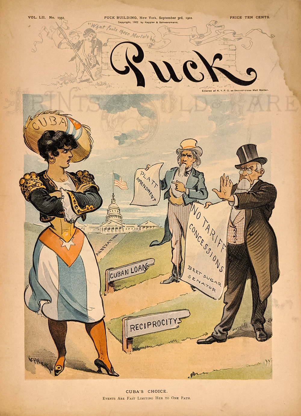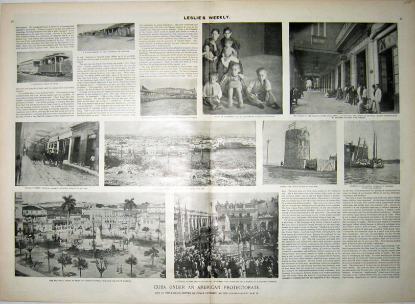 ![]() 224cuba: Cuba being helped by Columbia (U.S.) while Spain looks on (1874) under the dove of peace Hamilton Fish U.S. Sec. of State broker a peaceful settlement of the Virginius Affair rather than listening to “War Holwers.” 1874 Harper’s Weekly. Hand colored, wood engraving. 11 x 16 in. $40 ![]() 226cuba: Cuba's Choice. "Events Are Fast Limiting Her to One Path." 1902 Puck Magazine. Shows a young woman wearing a hat labeled 'Cuba', standing trying to decide which of three paths to choose; the first path, labeled 'Reciprocity' leads to an angry 'Beet Sugar Senator' who is offering 'No Tariff Concessions', the second path labeled 'Cuban Loan' leads to Uncle Sam offering the 'Platt Amendment', and the third path leads to the U.S. Capitol and 'Annexation'; neither path looks promising to her. 10 1/4 x 14 in. $100 ![]() 227cuba: A Warning Voice "Stop! while there is yet time, and follow the road I am pointing out to you." 1897 Puck Magazine. Showing lady 'Justice' trying to tell 'Spain' to go to 'Honest Upright Goverment & Reform'; instead they chose 'Irretreviable Ruin & Extinction'. 9 3/4 x 13 1/4 in. $100 ![]() 228cuba: As The Old Spanish Throne Topples, Up Goes the Cuban Flag of Independence. 1897 Judge Magazine. Depicting the Spanish throne tumbling, under the weight of 'Depleted treasury,' 'Mortgage,' etc., from atop a pile of blocks--"Corrupt aristocracy," "Antagonism to civilization," "16th century methods" -- as Cuba raises its flag of independence across the water. 13 3/4 x 21 in. $100 ![]() 207cuba: Three hand colored engraved images from the February 1, 1879 issue of Frank Leslie's Illustrated Newspaper. Scenes and Incidents of a Winter Residence in Havana. Shows three different views of the Fish Market, the interior, the end of the market, and the bay behind the market. 11x16 in. $50 ![]() 208cuba: Hand colored engraving from the January 25, 1879 of Frank Leslie's Illustrated Newspaper. Three images of Scenes in Havana. Large top image captioned, Scene at the Drawing of the Havana Lottery in the Court of the Old Custom House. Lower left image captioned, A Water-Side Express. Lower right image captioned, The Lottery in the Calle Barrillo. 11x16 in. $50 ![]() 209cuba: Cuba.-Scenes in Havana - Incidents of a Winter Residence in the Cuban Capital. Three hand colored engravings on one page. From the January 18, 1879 issue of Frank Leslie's Illustrated Newspaper. 11x16 in. $50 ![]() 213cuba: 1879 Havana, Inlet Cuba and two other wood engraved scenes from the German issue of Frank Leslie's Illustrated Newspaper. 16 x 11 in. $40 ![]() 214cuba: 1880 General Grant in Cuba - The Trip To San Diego - Drawn From Sketches By Frank H. Taylor. Four hand colored wood engravings published in Harper's Weekly on March 6, 1880. Each scene captioned as follows: Ball By The Natives - Dancing The "Zapateo" (Showing a couple engaged in a dance routine); "A Leading Occupation" (Showing a man asleep in a chair); The Village And Baths Of San Diego (Showing a narrow bridge leading to a small town); AND On The Road To San Diego - Travelling By Volante (Showing a well-dressed couple riding in a fancy carriage driven by three horses and a horseman). 11x16in. $50 ![]() 220cuba: 1899 Cuba Under An American Protectorate - Life in the Famous Centre of Cuban Interest, As Our Correspondent Saw It. Eleven half-tone pictures reflecting various places in Havana, including a picture of a family of suffering and half-starved Cuban children. Pictures and text published in Leslie's Weekly in 1899. 16x22in. $60 ![]() 221cuba: 1899 Cuba's Day of Freedom. Four half-tone pictures with text published in Leslie's Weekly on January 26, 1899. Top two pictured depict the Spanish General Castellanos on his way to the wharf and his farewell to Cuba. Large picture in the middle depicts the Last Troop of Spanish Soldiers Leaving the Palace; and the bottom picture depicts the Spanish Guard Drawn Up Before the Palace After Vacating the Guard-House For the Last Time. 11x16in. $40 ![]() 222cuba: 1899 Havana Flies Our Flag - Five half-tone pictures with text published in Leslie's Weekly on February 2, 1899. Each picture depicts how the Cuban capital looked in its new decoration of the star-spangled banner on Evacuation Day, January 1, 1899. 11x16in. $30 |