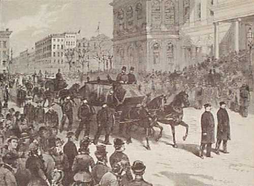 ![]() 007dth: 1884 New York Funeral Procession. Engraved image from Harper's Weekly, titled "The Funeral Procession Passing the City Hall, New York." Shows a horse-drawn hearse moving past a crowd of onlookers. 8x11 in. $20 |
