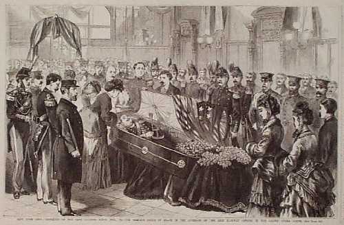 ![]() 015dth: 1872 Funeral Scene: Viewing the Coffin. Engraved image from Frank Leslie's Illustrated Newspaper, titled "New York City: Obsequies of the Late Colonel James Fisk, Jr.: The Remains Lying in State in the Corridor of the Erie Railway Offices in the Grand Opera House." Shows Fisk's body in the coffin, with mourners filing past. 11x16 in. $30 |