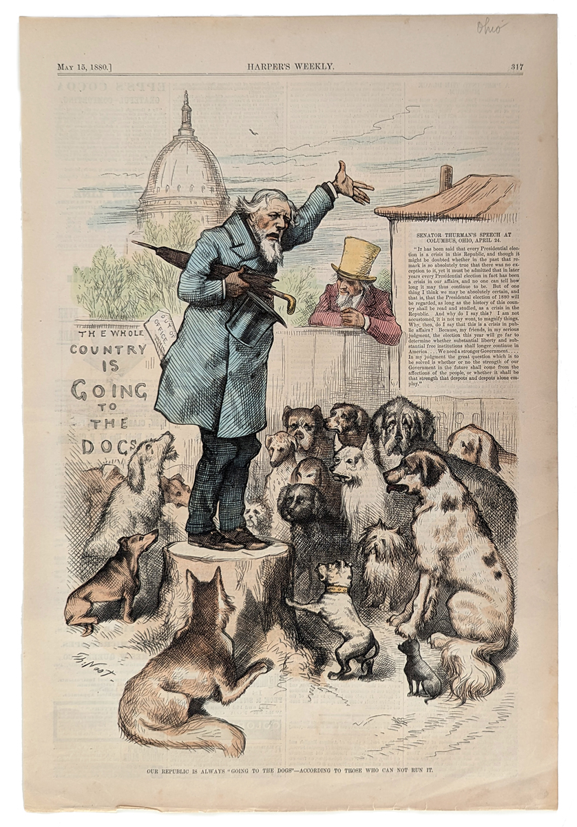 ![]() 01elections: Our Republic is always 'Going to the Dogs' - According to those who can not run it. Senator Thurman's speech at Columbus, Ohio , April 24. 1880 Harper's Weekly. Hand colored, wood engraving. 10 1/2 x 11 in. $60 |