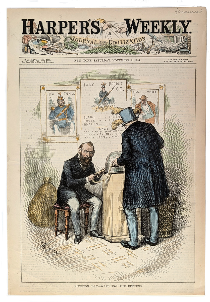 02elections: Election Day - Watching the Returns. A warning from Harper's Weekly and artist Thomas Nast that in electing Blaine the voters would really be choosing Jay Gould to run the country in his own self-interest. Significantly, Blaine has turned his back on the nation, contrasting with the full frontal view of Gould, who anxiously checks the election returns. 1884 Harper's Weekly. Hand colored, wood engraving. 10 1/2 x 15 1/2 in. $60 b/w: $30 |